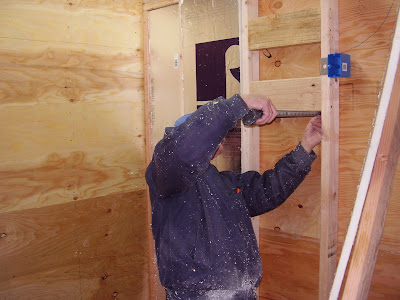 You can see Stet has been cutting the insulation board with a hand saw. It is really pretty easy to cut it to size and get it to fit pretty tight. I have not been foaming it in because it is so snug. We used a 2 inch piece thick piece and then a 1 inch piece and that is pretty good at filling the space. It is hard to tell from this picture but I am using Rmax board insulation for this corner. I am going to spray the rest of the trailer with Foam It Green - closed cell foam insulation. The Rmax gives me an insulation value of R-18. The spray closed cell foam will give me an insulation value of R-21. Look for a good explanation of what it is like to spray foam a mini mobile cottage in about 5 weeks when we get some warmer weather and I have put the roof on.