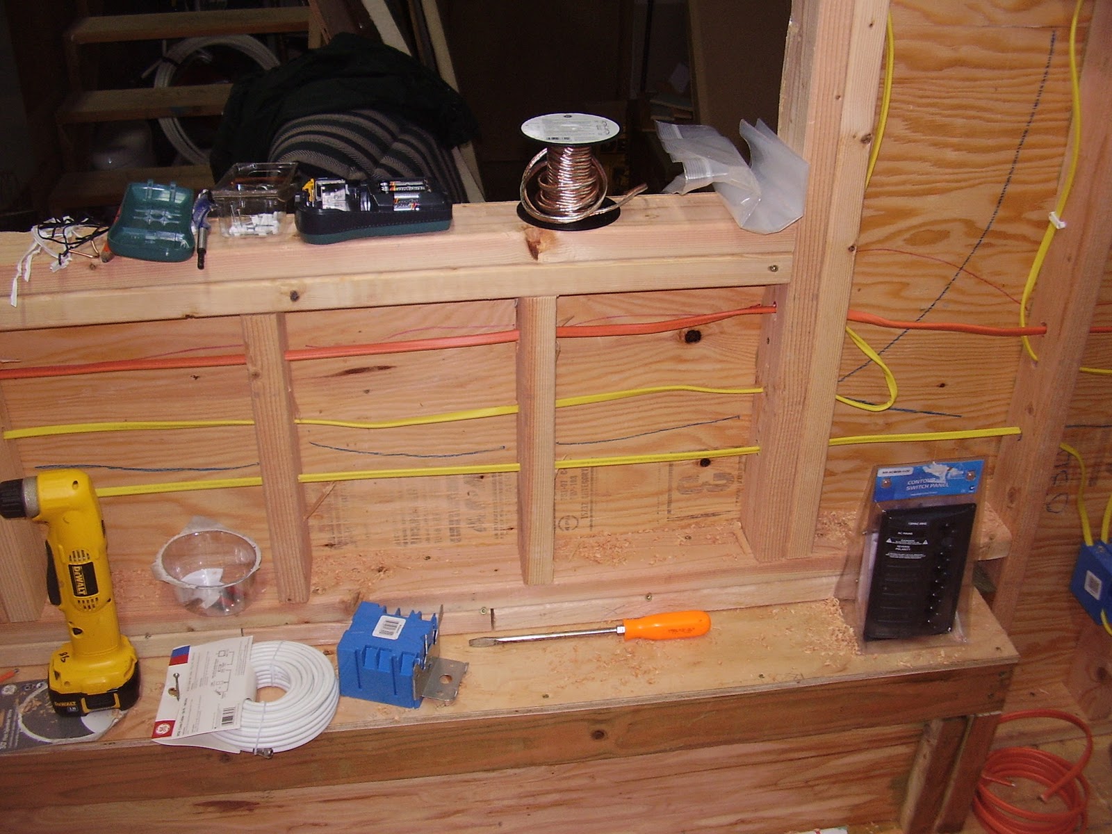 I have about 80% of the holes drilled and should have the rest done early next Saturday. Then I start pulling wire. I am using standard 12/3 NM for all of the AC electrical. I am using 10/3 for the DC. It went faster then I thought to lay it all out, I am sure pulling the wire and getting into and out of the boxes is going to be fun.