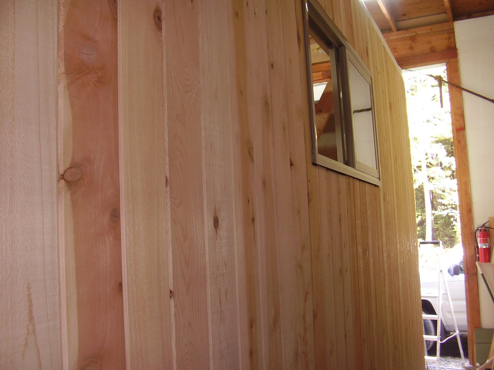We had a change in plans for Sunday so I adjusted and moved into coating the Cottage with Log Oil. The big challenge in our neck of the woods is mold. Even fresh kiln dried cedar like this will mold if covered with standard treatments. Log Oil is a what is regularly used in this very damp climate. If nothing else it came out looking just awesome. Here is a before shot of the Tongue end.