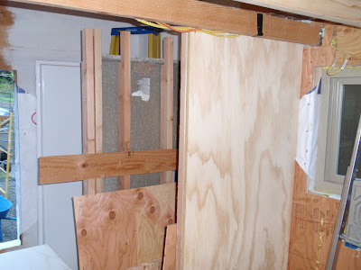 We got the shower in place, putting a plywood sandwich under the shower structure. I am using a one piece fiberglass shower bought from Home Depot. I looked and actually purchased a multi-piece shower from Ace Hardware but after looking at it, it went back to them and I doubled my cost with this unit. As you can see we coated the back plywood water proof/mold resistant paint drilled the hole for the drain and slide the shower in. It fit snug and with a few shim's under the unit it was rock solid. Once we had it in place, I used foam to give it a custom fit bedding. As you can see from the photo below, Stet build a 2x4 stud wall with all the 2x4's on end and notched at the top to fit the ledge of the shower.