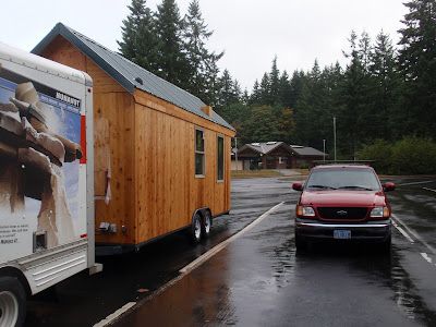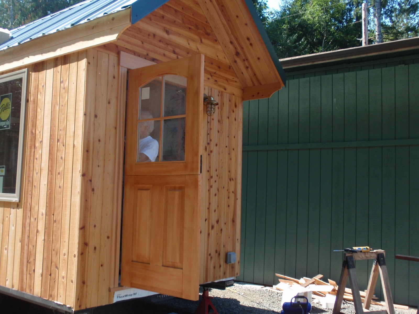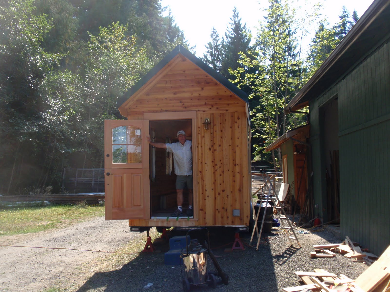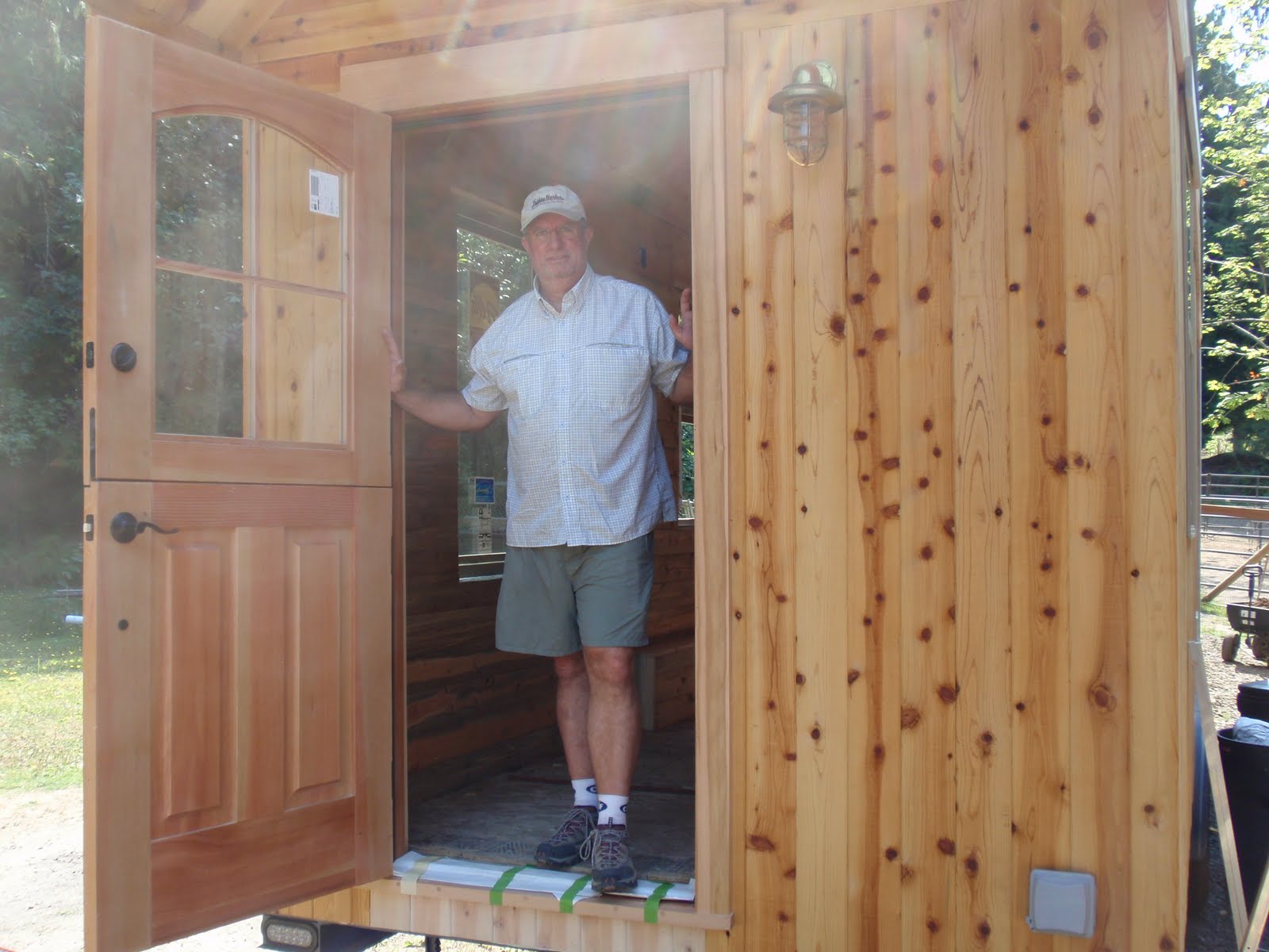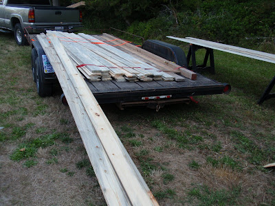 These boards above are cut down 2x4's to be 2 1/2 inches wide. I stained them and am going to use them at the top of the wall to separate the ceiling boards. They should provide a good transition piece. As you can see I have part of my deck done. I am going to put a roof on them that is a mirror of the house roof just a little lower. I am hopeful to have a dry environment on the deck so that I can set up my trainer for my road bike. I am eager to start riding again as I have give it up for 2011 to build my mobile cottage. Off the deck is the mini orchard, my view.