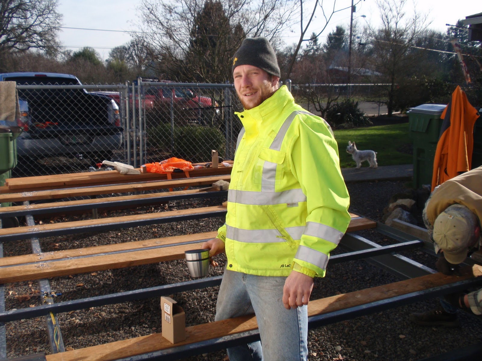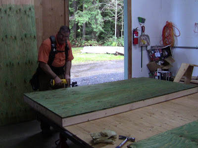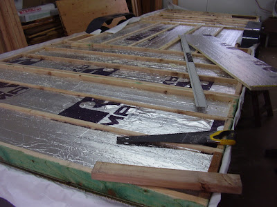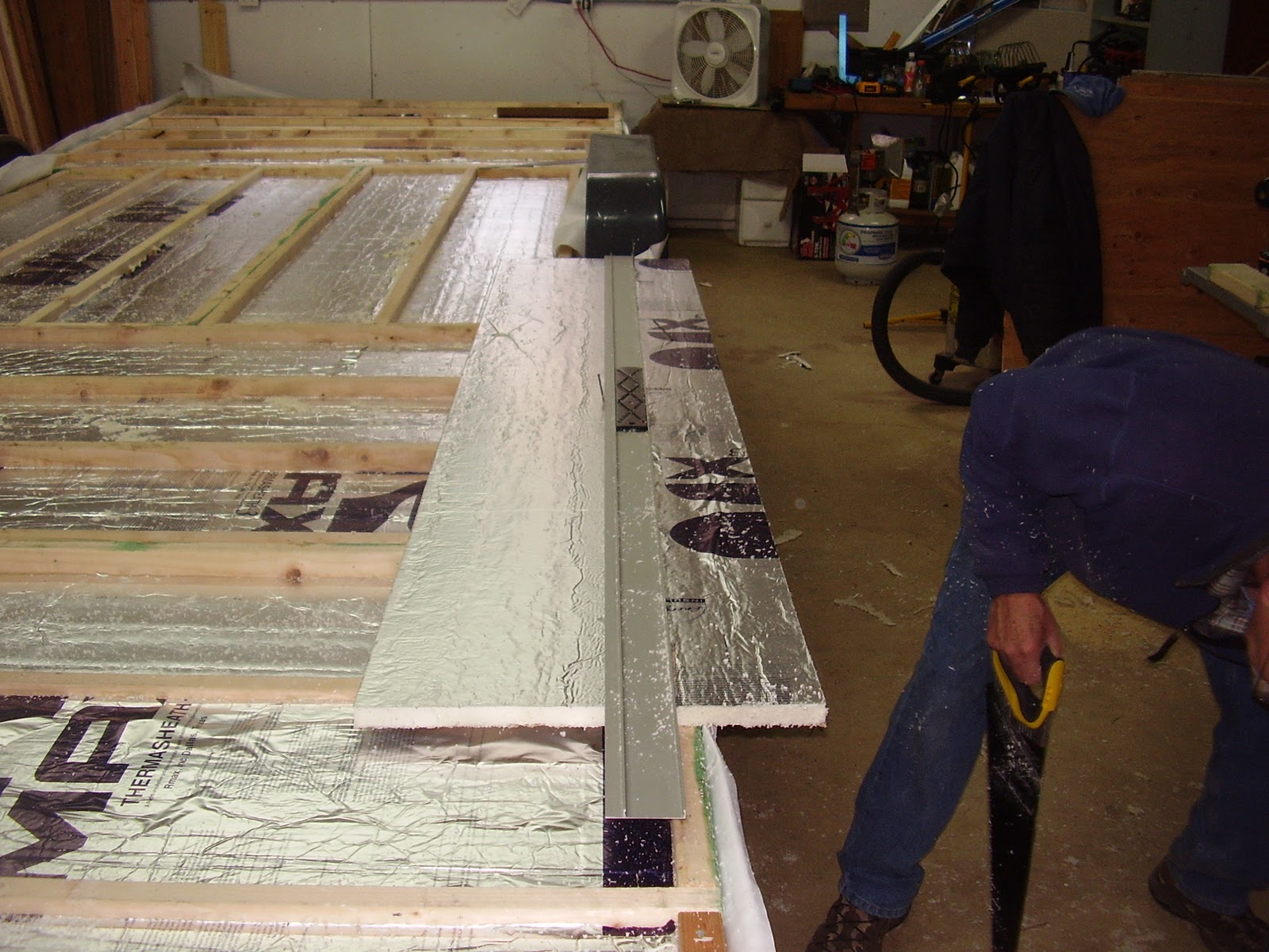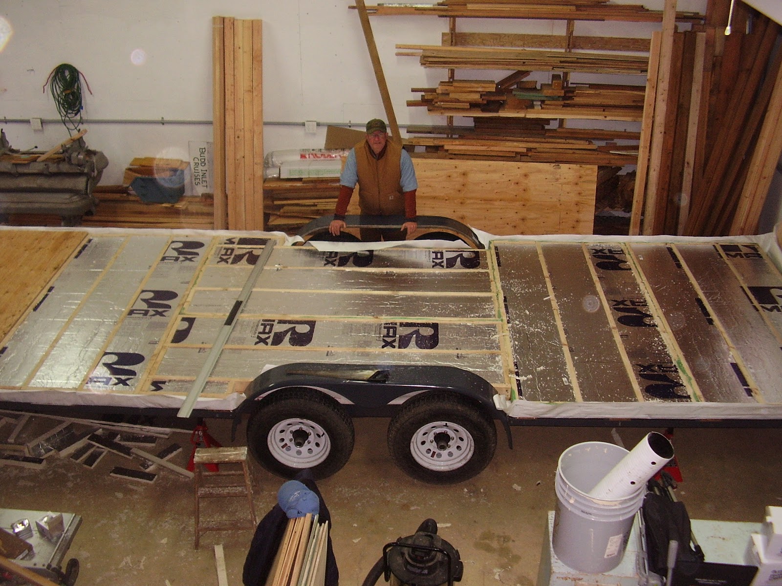 We had a complex weekend of transitioning from the foundation build to getting the flooring in place and building the boxes that will house the wheel wells. Key decisions we needed to make is where are the internal walls were really going to go, lay out the kitchen cabinet, lock down where the door is going to go. I knew what wall it was going in, but had not decided how far from each side wall it will be. I needed to know this as I will run flooring out that door space that I can cut to the right length once I have a door to put in. Once we got all the insulation in, we screwed and glued each of the top panels in. I then put down a layer of under-layment for the hard wood floor.