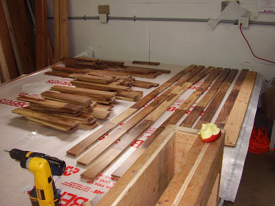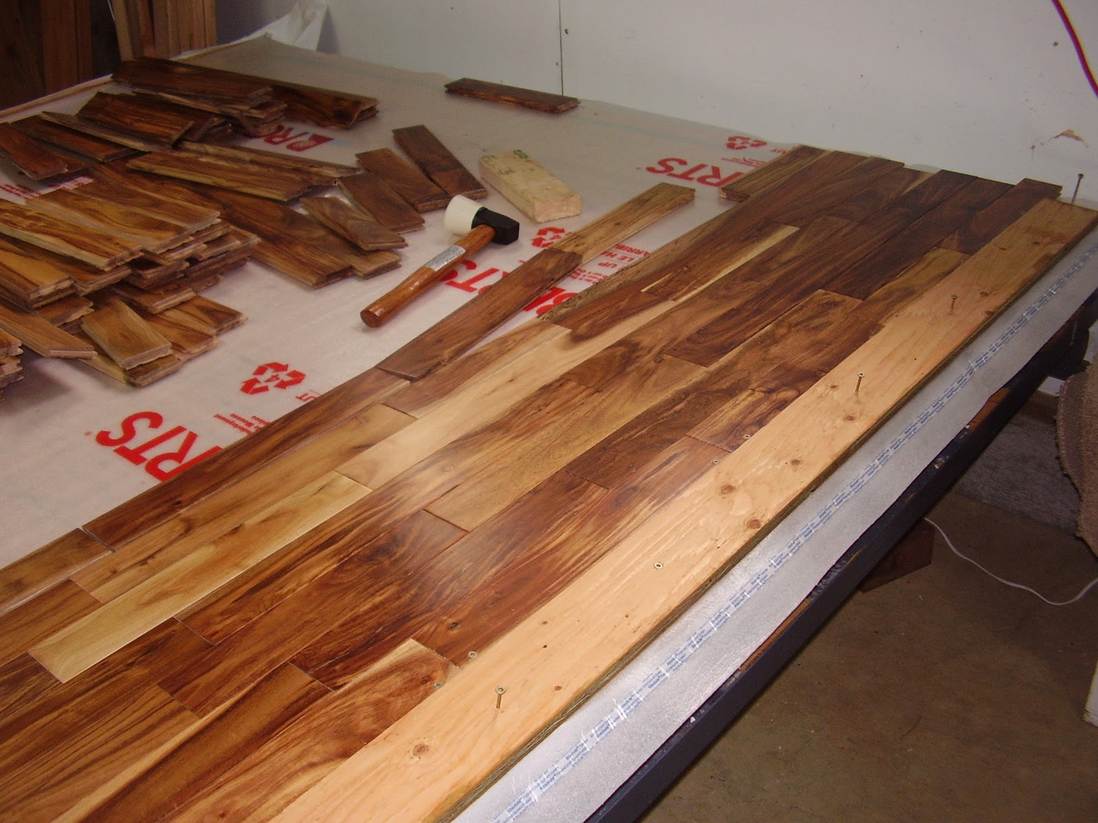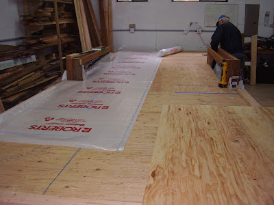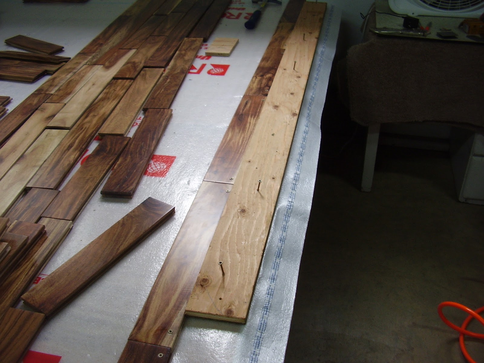 Another part of the complexity was that I had never laid down hard wood flooring, for that matter any type of flooring. I had a challenge with the flooring gun that I bought. For those of you who are wondering why I bought a Flooring gun and did not rent, rentals of the gun is around $90 bucks a weekend, I figured it would take me two weekends or $180. The gun cost $200 and at this rate the two weekend plan still looks like a reasonable guess. It took me a bit to figure out how to use the gun and I only destroyed about 4 boards as the bracing board moved by the action of the hammer and power gun thus making the wall off square. I tore them up and started over again screwing the perimeter boards in. These screws will be covered by the T&G wall boards. After a little bit of tweaking the floor is coming out fine. I am pleased with the choice of wood, Acacia, blond stained. I layed out about 8 rows and made sure all of the joints were off set. I expect to be finished by the end of next weekend and we will move on to framing in the walls.