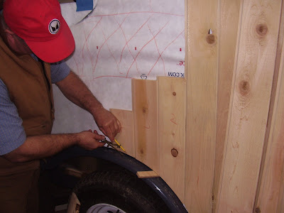Going through all the wood and am pretty pleased with the quality considering these are all seconds. We started in the far corner working our way to the front of the trailer. The two things we are trying to accomplish is to keep the boards level and to not put any fastner's into the wiring. I took a red crayon and marked where the wires are. You can see we are putting the pieces in vertically. Since I am so long, 24 feet we thought the appearance would be better served by vertical look.
