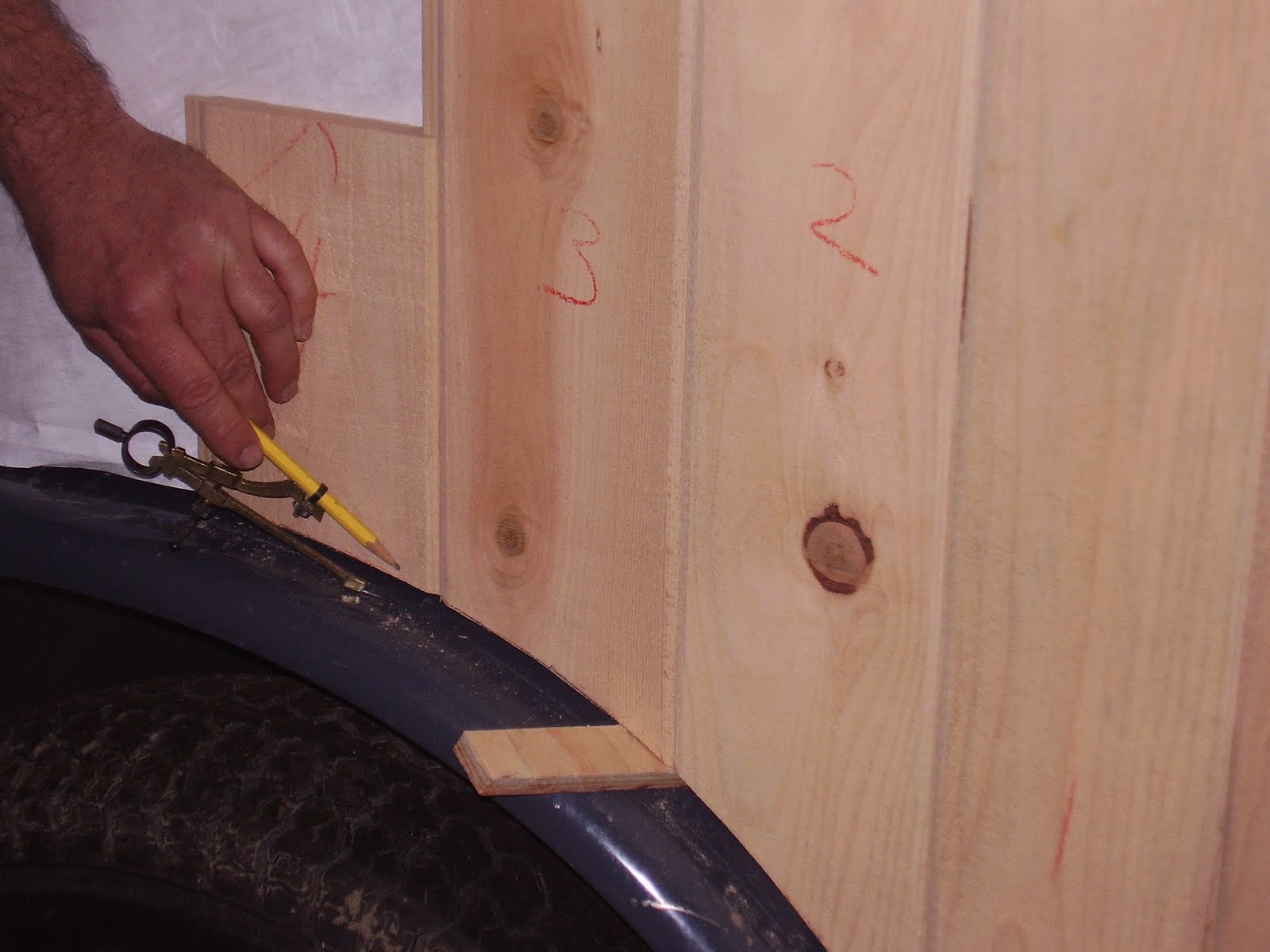 As we started down one side of the trailer I kept looking at the wheel well and thinking how are we going to do that. I had run through a couple of options when it was time to deal with it. Sure enough Stet walked over and grabbed a compass, the kind I used to use in grade school for drawing circles and we just created the gap we wanted and etched them into the board. We did cut a flat angle to get the board in position to mark this. Once we had what we wanted on sample board we cut them out with a steady hand and a jig saw. Each board was numbered and we just flipped them over when we got to the other end of the wheel well. It worked great!