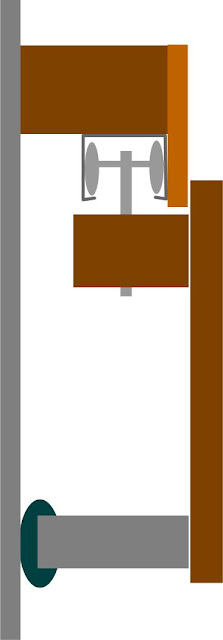 I also had time to start on my sliding table project. I am going to build a sliding table on a runner. I picked up a hanging door runner and the wheeled mechanism that goes in side it (in grey). I am going to construct a shelf to hide the runner and it will move as needed along the 8ft track. Here is a graphic of the slider and a picture of the bottom of the table (it is still in varnish mode).