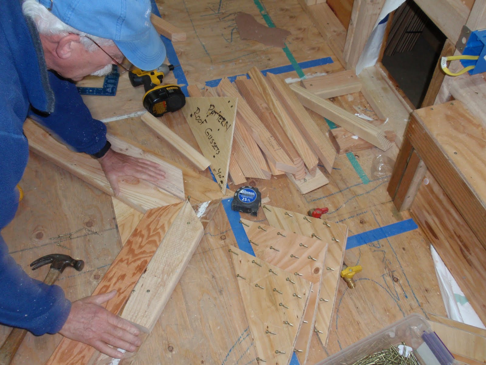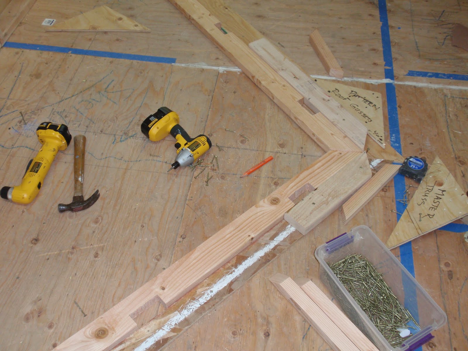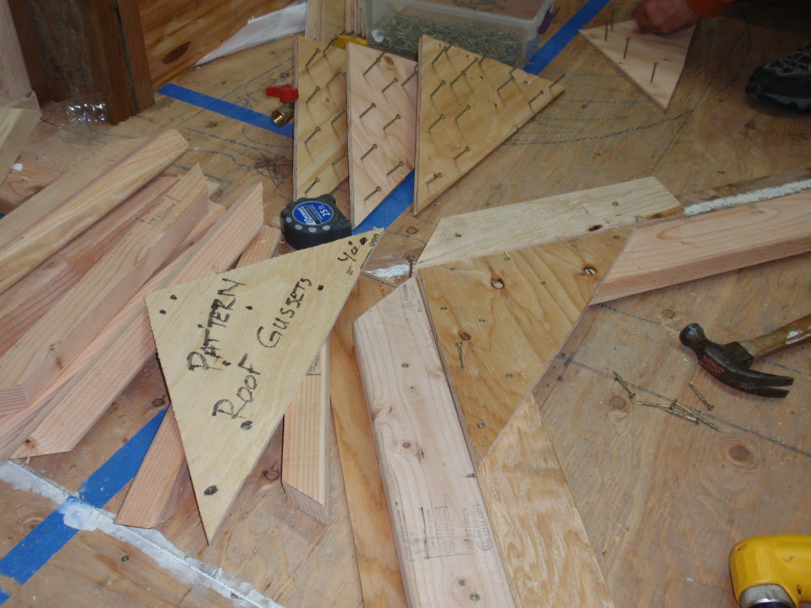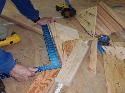 We built a template on the floor and cut out the Gussets, I am pre-staging the gussets with all the screws in place. We need 13 rafters so we set up this little production line and we went after it.