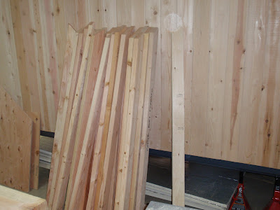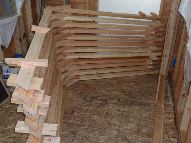 Well I am waiting for the weather to improve here in wonderful wet Olympia, WA. Man it has been wet, I am a native of the Pacific NW and have seen some pretty wet springs but I have a project to complete and this weather is not helping. I need three good days over a weekend. As of now the plan is the first weekend in June for the roof event. Over the next weekend we will take all the pieces and assemble them, install the Simpson ties and be ready...for good weather. We cut all the joist so here is a shot of them (above). Boy they look small but they fit right so we will see.