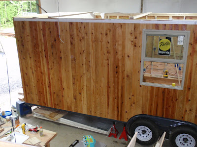 We were able to finish both sides of the Mini Mobile Cottage with siding. Feeling very good about the progress. It looks pretty good to me, we will be putting log oil on the wood to treat it. I expect to be done treating both sides next weekend.