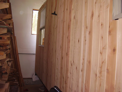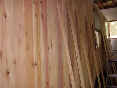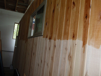 We had a change in plans for Sunday so I adjusted and moved into coating the Cottage with Log Oil. The big challenge in our neck of the woods is mold. Even fresh kiln dried cedar like this will mold if covered with standard treatments. Log Oil is a what is regularly used in this very damp climate. If nothing else it came out looking just awesome. Here is a before shot of the Tongue end.