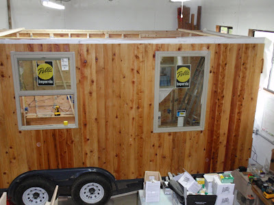 The window wrap came out excellent. You can also see the roof joist we are building. We have them measured out and I will order the metal roofing this week. Stet is going to go buy the 2x4's we need and some extra siding for the ends. I am confident we can get the trailer pulled out and prepped and the roof on in May!