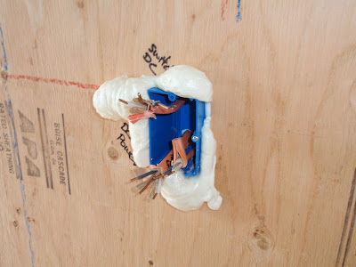 After installing the interior plywood we went in and moved all the plug boxes out the appropriate depth. I then went through and sprayed some foam insulation to seal those areas. As you can see I was a little more robust on the foam then I really needed to be but it is pretty easy to cut the excess off and I am very close to installing the hardware once the T&G is in place.