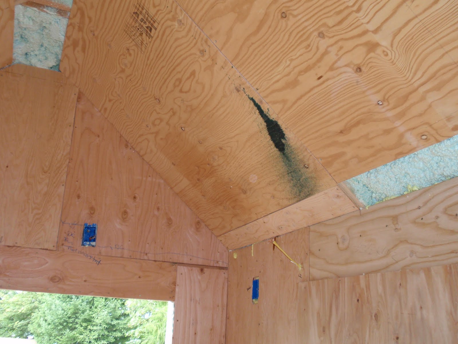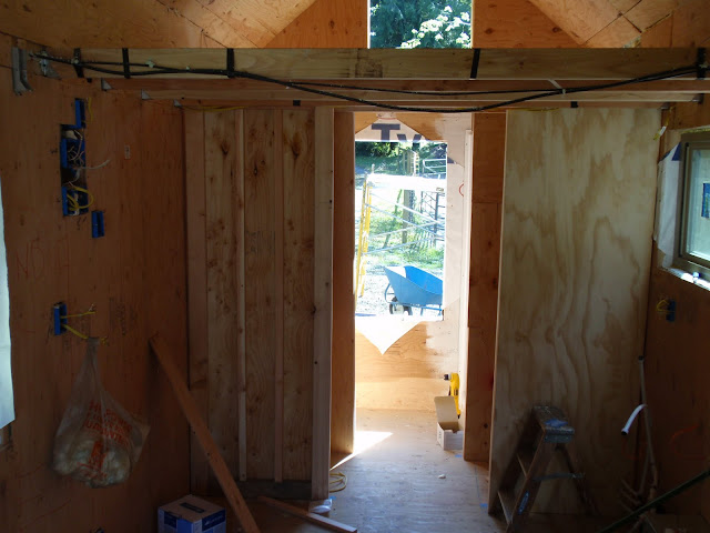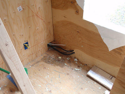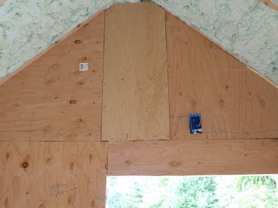 We started working on the other walls and now the inside is starting to get a little more closed in. I am going to take the Labor Day week off from work and I expect to move mountains during that week on finishing the cottage. After I leave on the 10th, I will return to pick the her up and see how "mobile" she is as we make the journey back down to Dundee. It freaks me out just to think about it.