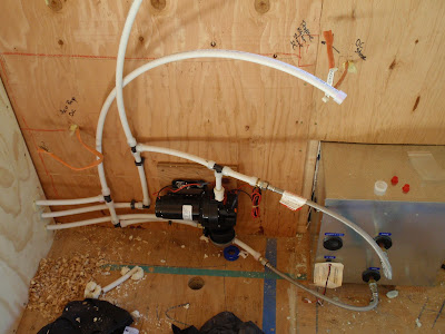 Plus he had all the cool tools and fittings that I don't have. I am sure if I did this part of the project, it would have cost me no less than three runs to Home Depot. Saved gas and helped out a local contractor and ended up with no leaks when we pressure tested it! So I now have a plumbed shower, hot water heater, water pump, and a place to hook up my catchment system from the gutters. Pretty dang cool if you ask me.