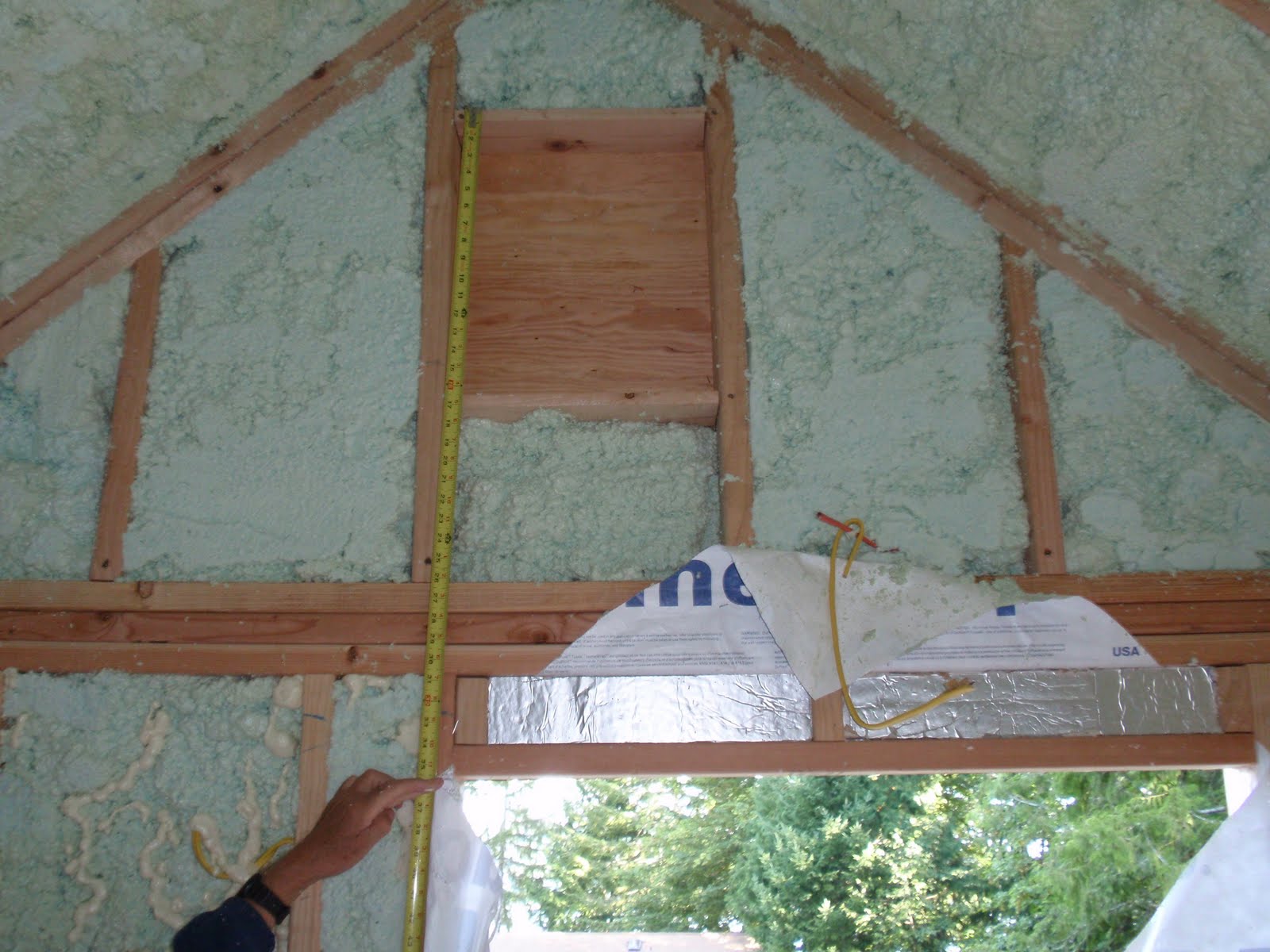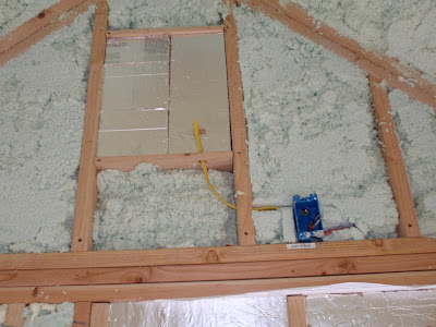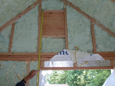 I have a great 12 volt fan that I can use but am not convinced that I need it. So we created a spot for it, wired it and then filled it with insulation, took some good pictures and then will seal it up and can go back and cut it out if needed. I will install the thermostat after we have put up the Tongue and Groove.