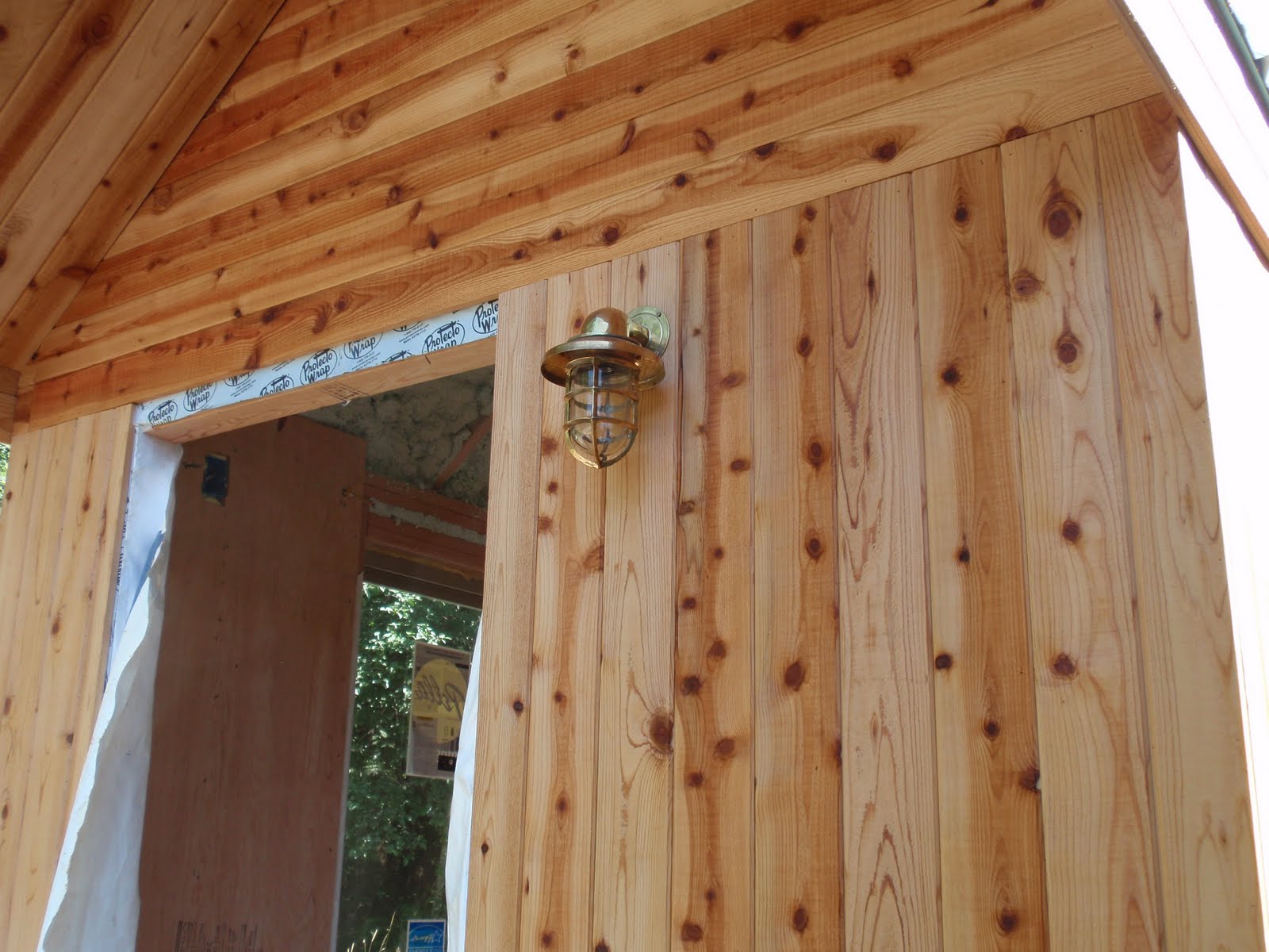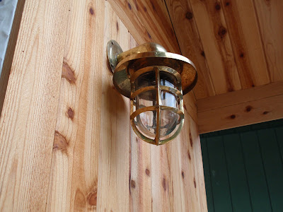 Since we will be sheeting in the door side of the house, I had to install the outside porch light. You can see my lighting motif, which I had taken off a ship. More of those to come. I am pleased with the look.