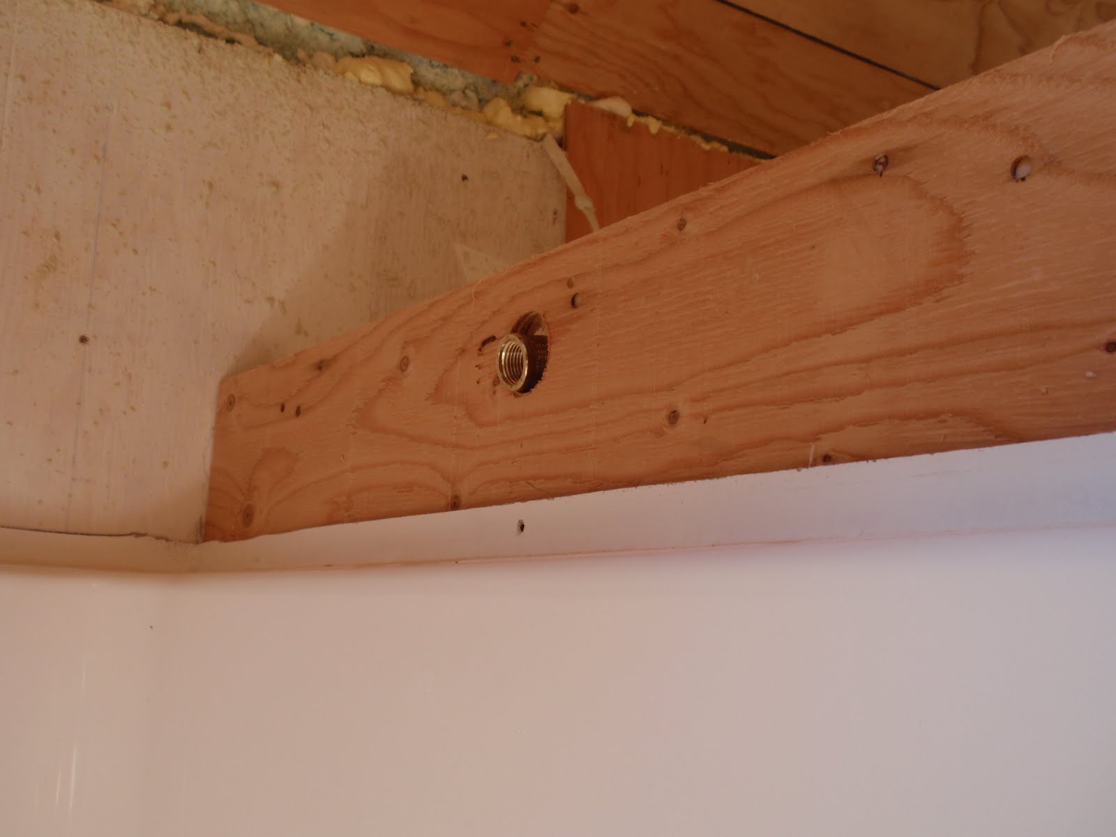 We got the shower in place, putting a plywood sandwich under the shower structure. I am using a one piece fiberglass shower bought from Home Depot. I looked and actually purchased a multi-piece shower from Ace Hardware but after looking at it, it went back to them and I doubled my cost with this unit. As you can see we coated the back plywood water proof/mold resistant paint drilled the hole for the drain and slide the shower in. It fit snug and with a few shim's under the unit it was rock solid. Once we had it in place, I used foam to give it a custom fit bedding. As you can see from the photo below, Stet build a 2x4 stud wall with all the 2x4's on end and notched at the top to fit the ledge of the shower.