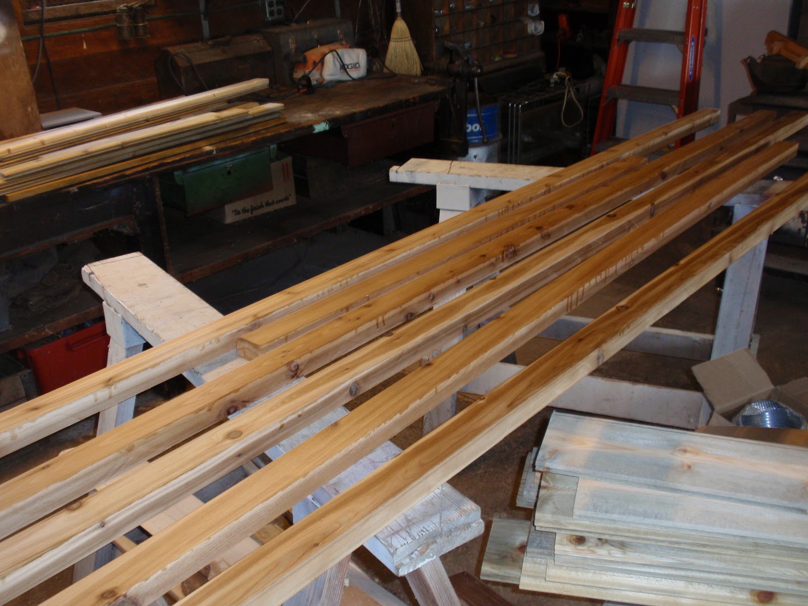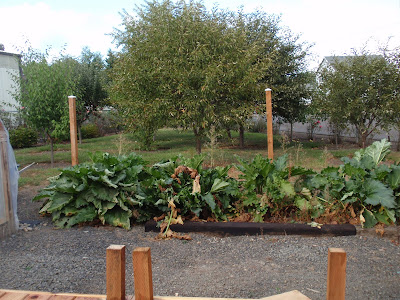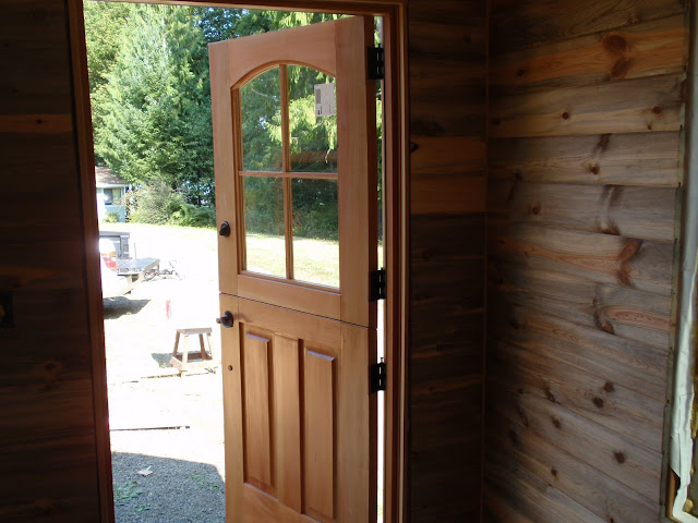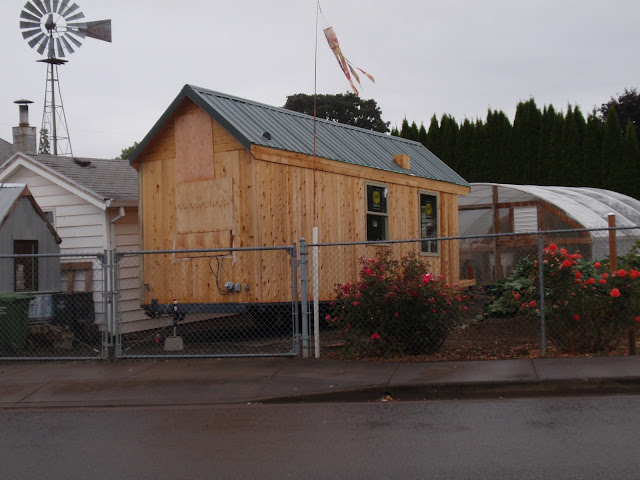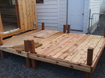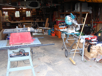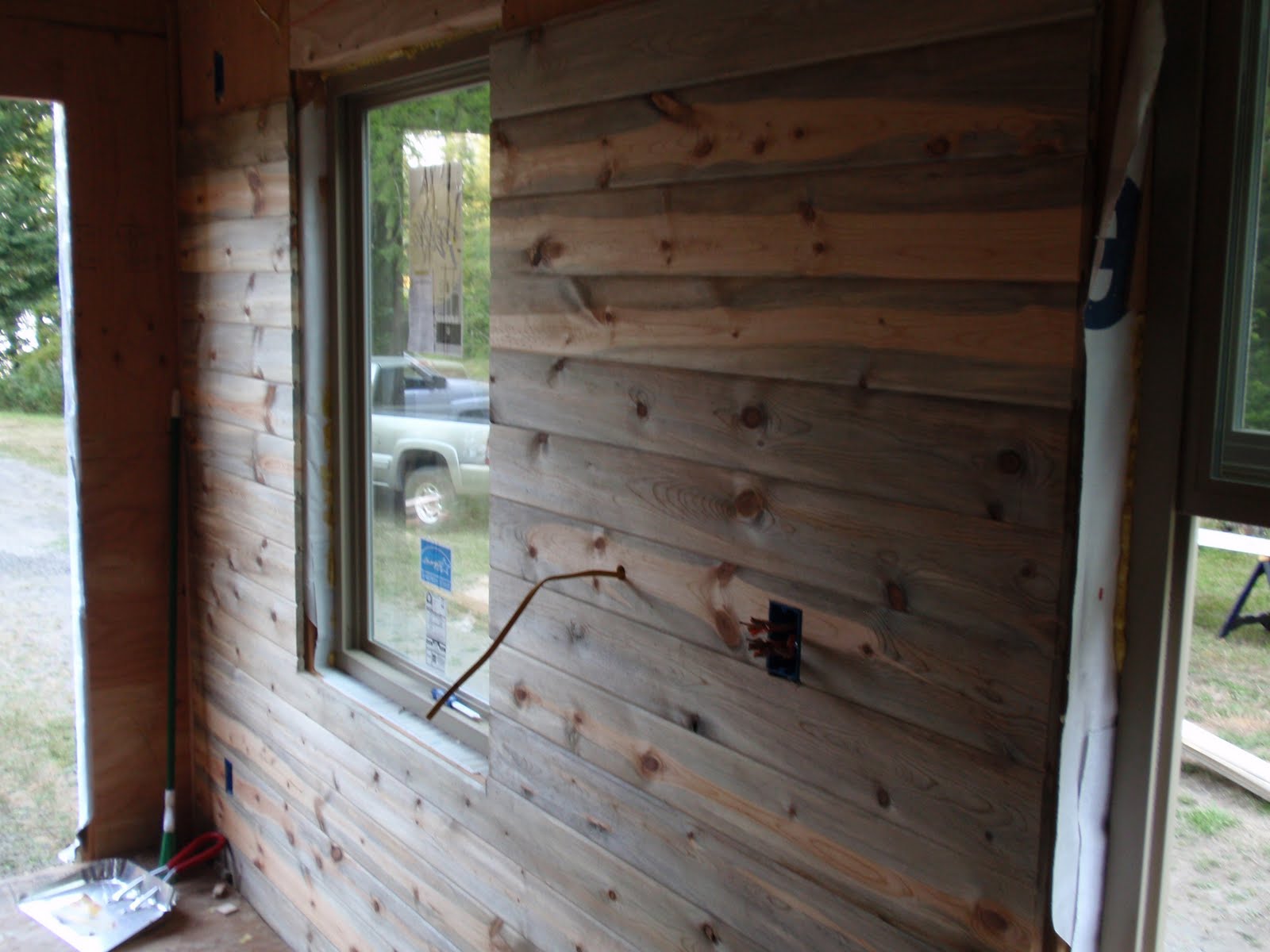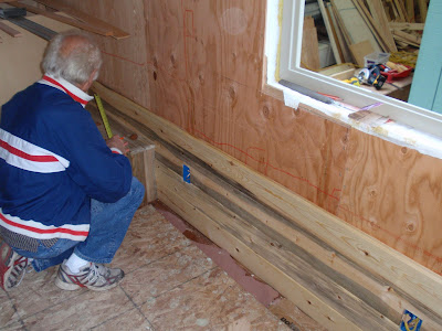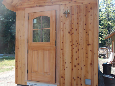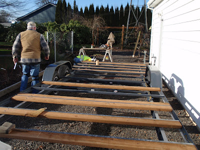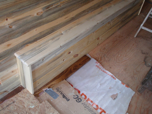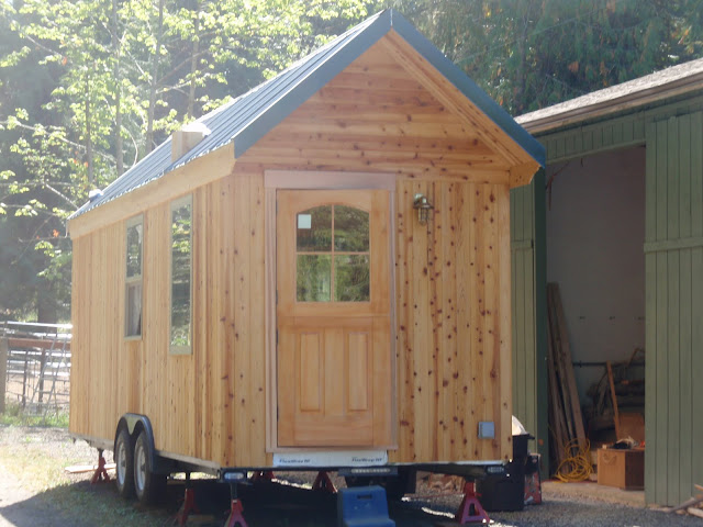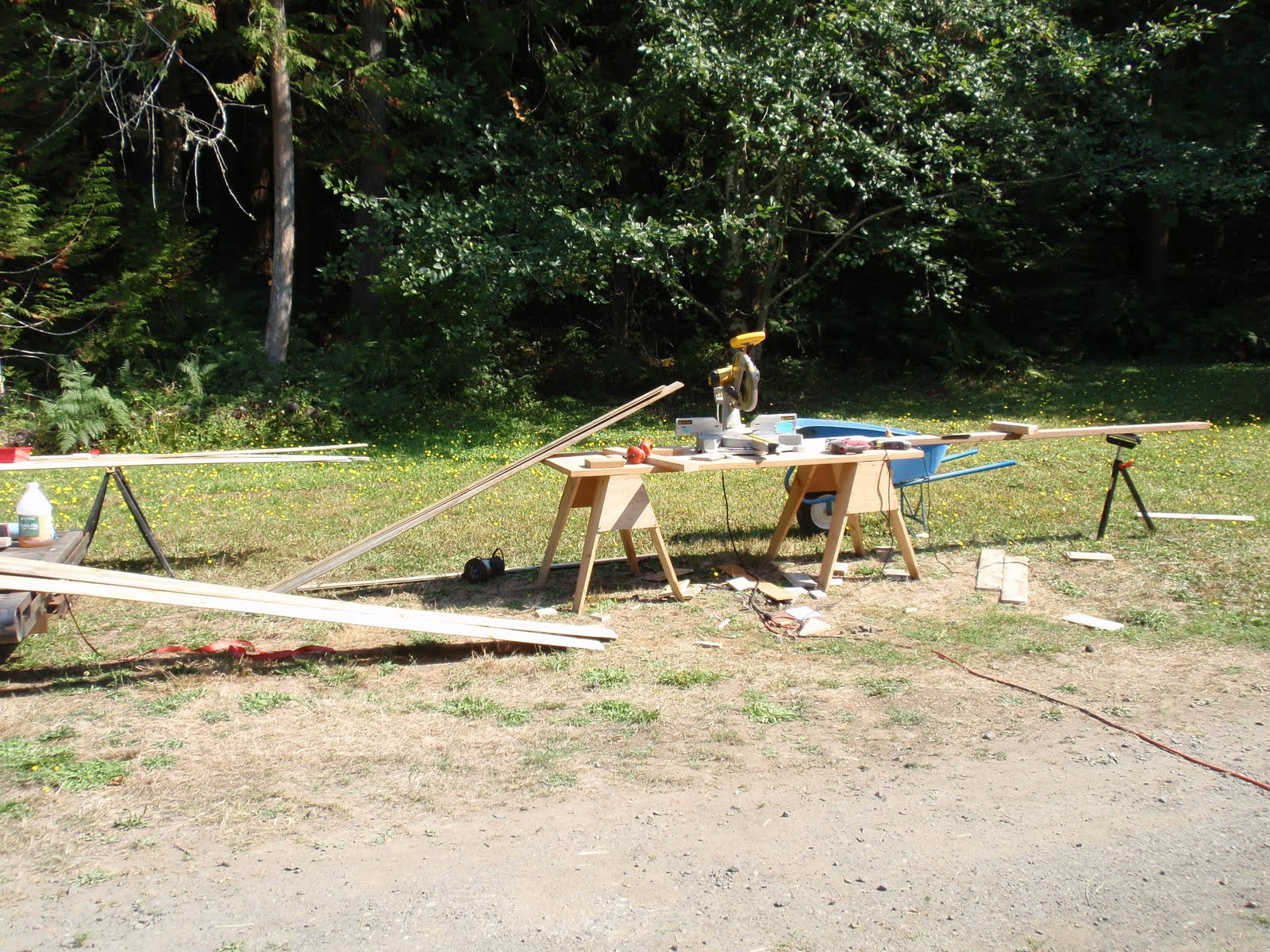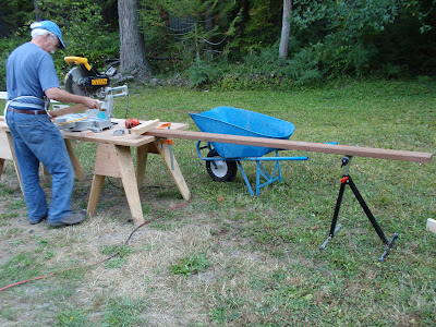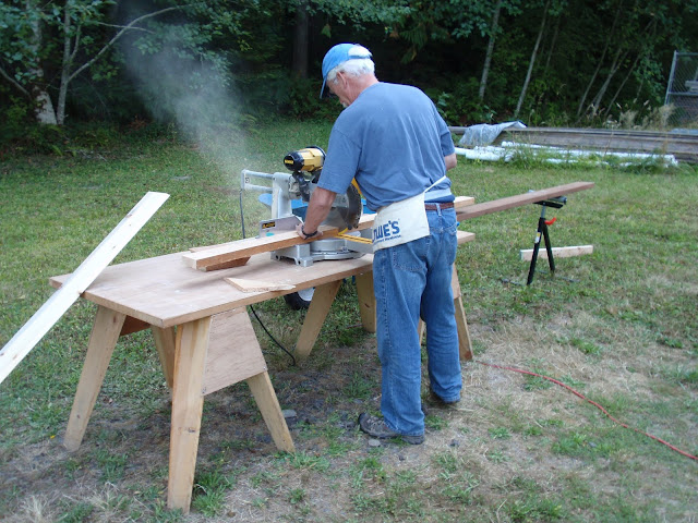 These boards above are cut down 2x4's to be 2 1/2 inches wide. I stained them and am going to use them at the top of the wall to separate the ceiling boards. They should provide a good transition piece. As you can see I have part of my deck done. I am going to put a roof on them that is a mirror of the house roof just a little lower. I am hopeful to have a dry environment on the deck so that I can set up my trainer for my road bike. I am eager to start riding again as I have give it up for 2011 to build my mobile cottage. Off the deck is the mini orchard, my view.