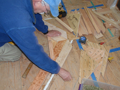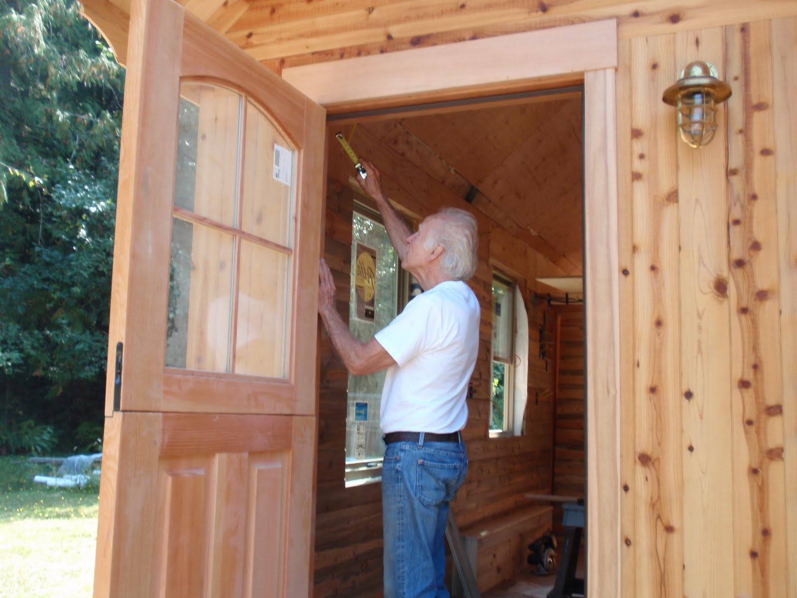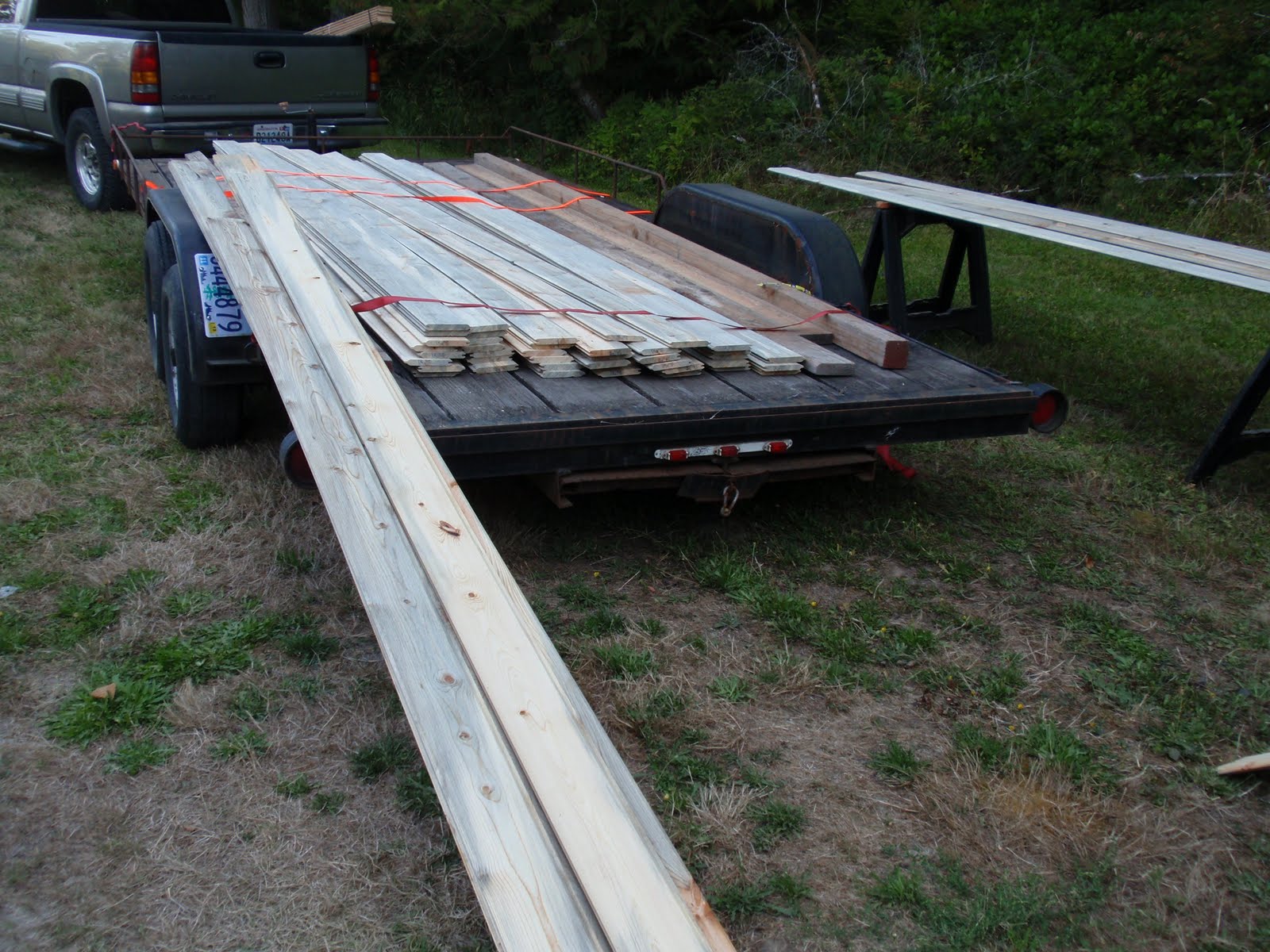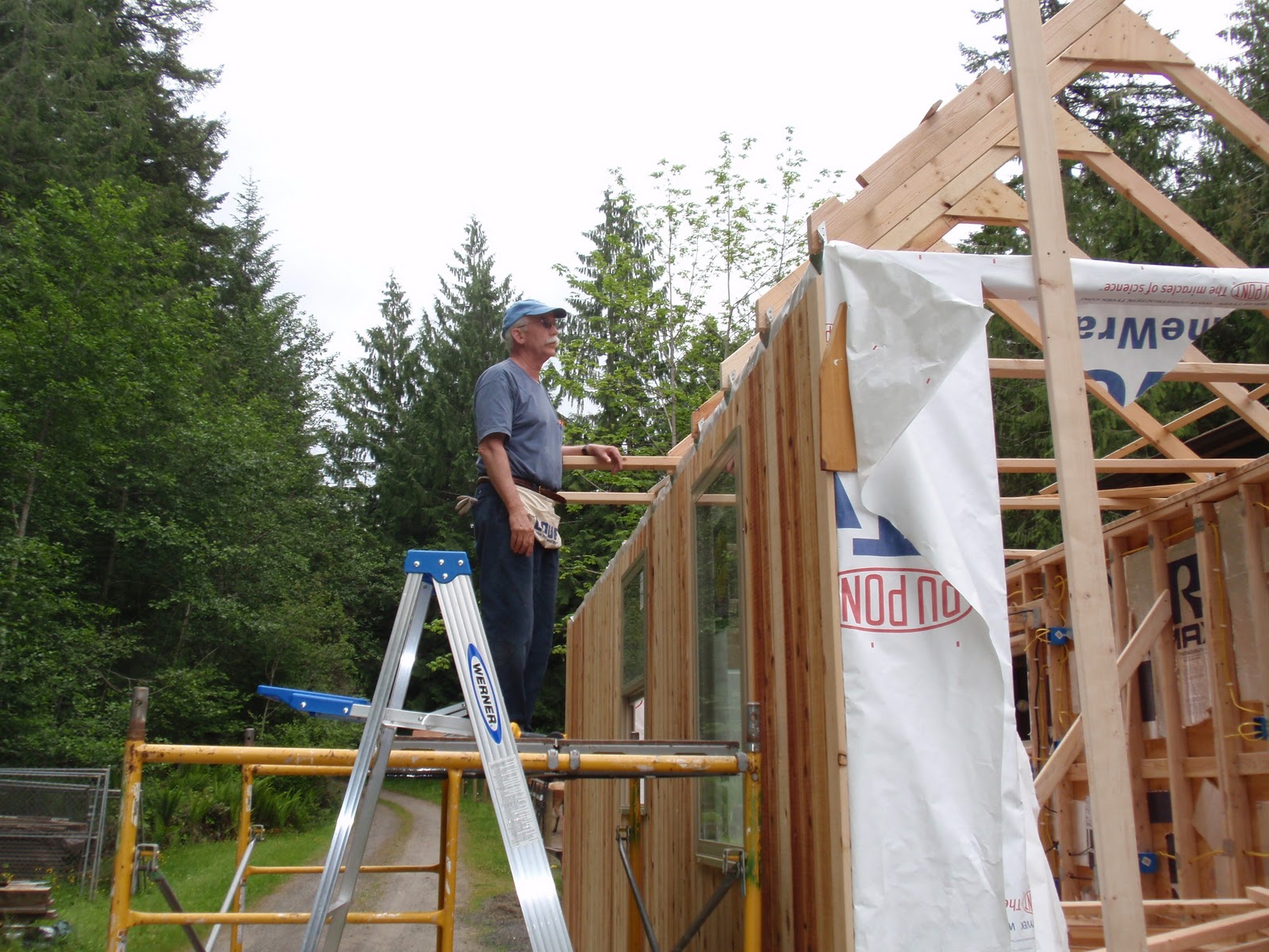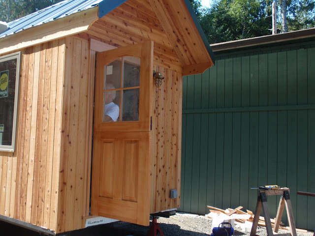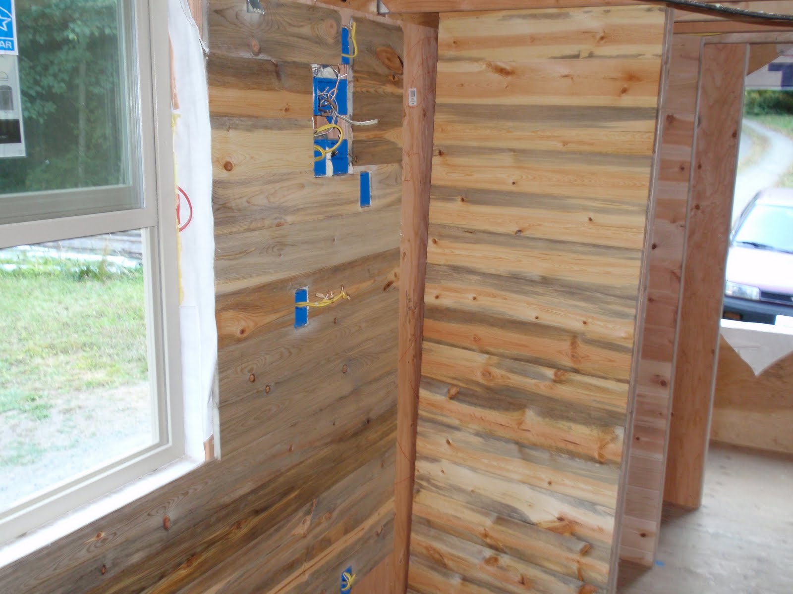 These boards above are cut down 2x4's to be 2 1/2 inches wide. I stained them and am going to use them at the top of the wall to separate the ceiling boards. They should provide a good transition piece. As you can see I have part of my deck done. I am going to put a roof on them that is a mirror of the house roof just a little lower. I am hopeful to have a dry environment on the deck so that I can set up my trainer for my road bike. I am eager to start riding again as I have give it up for 2011 to build my mobile cottage. Off the deck is the mini orchard, my view.