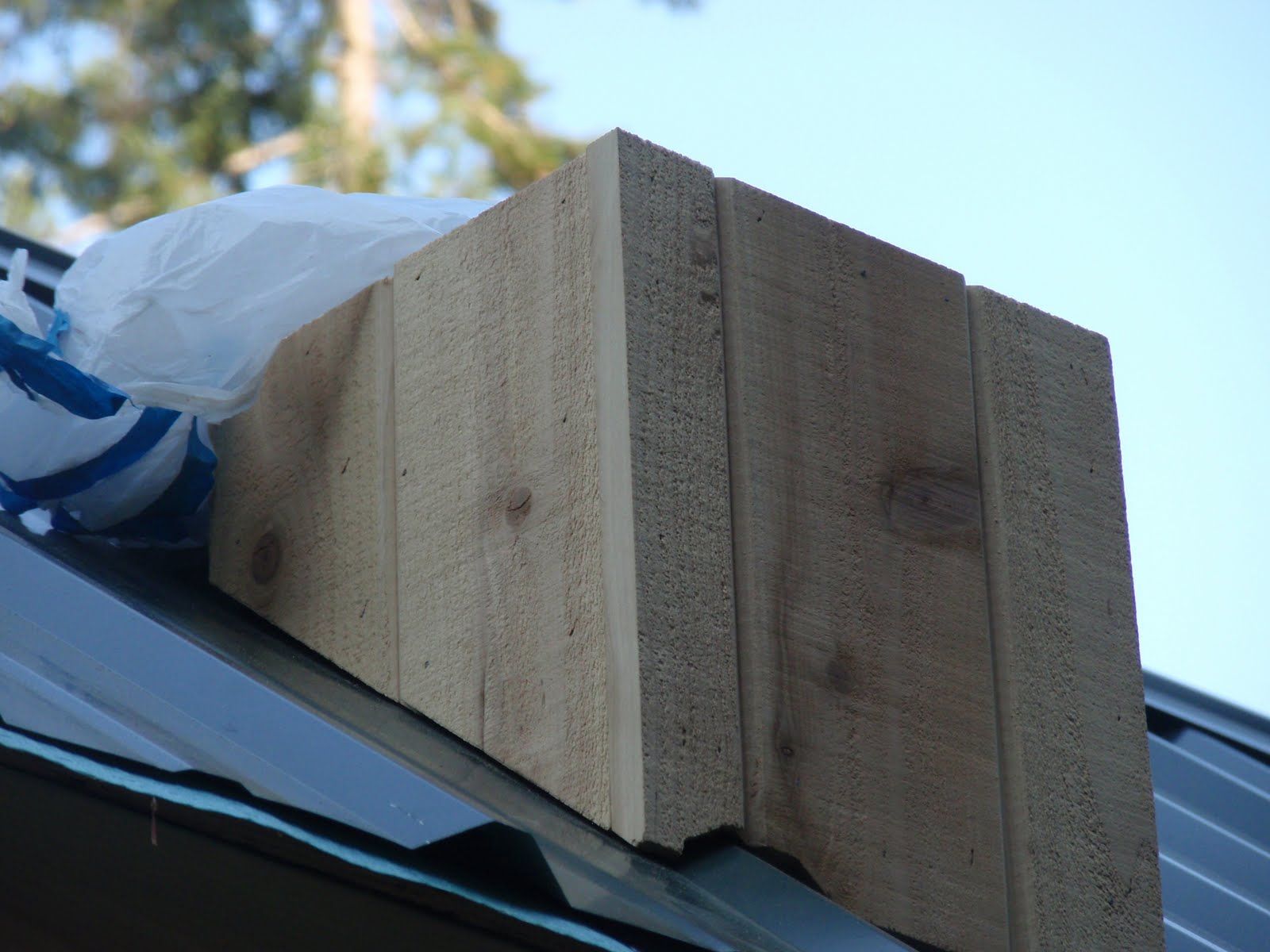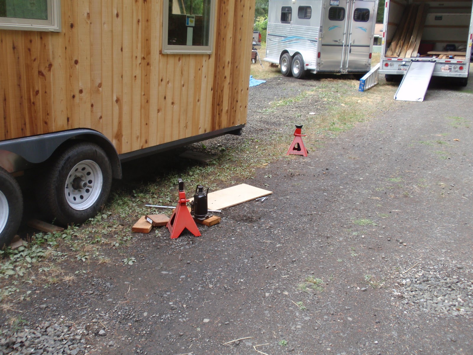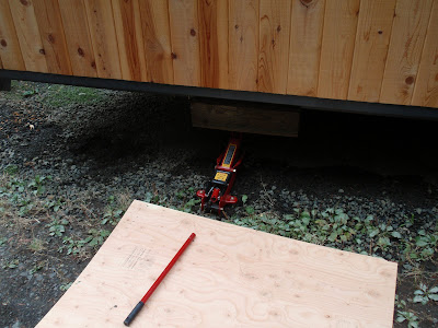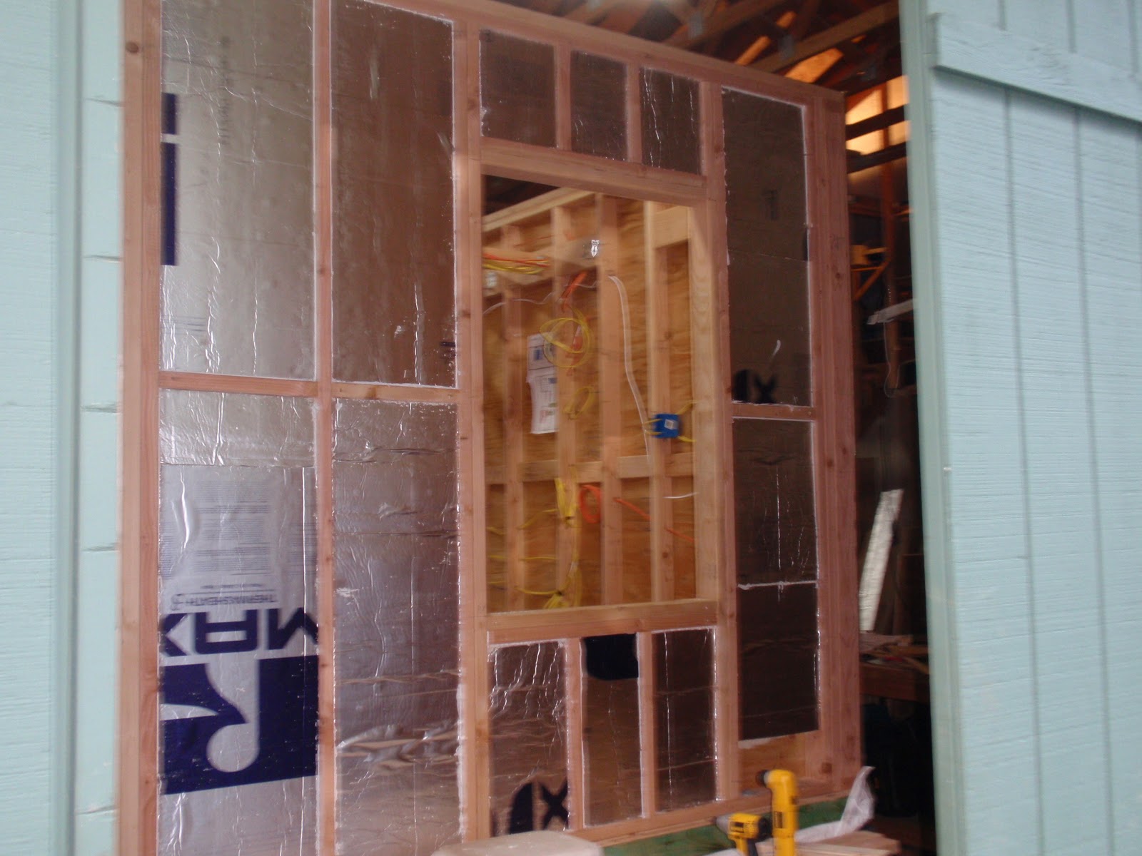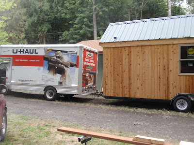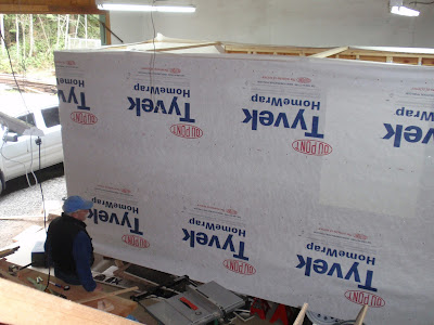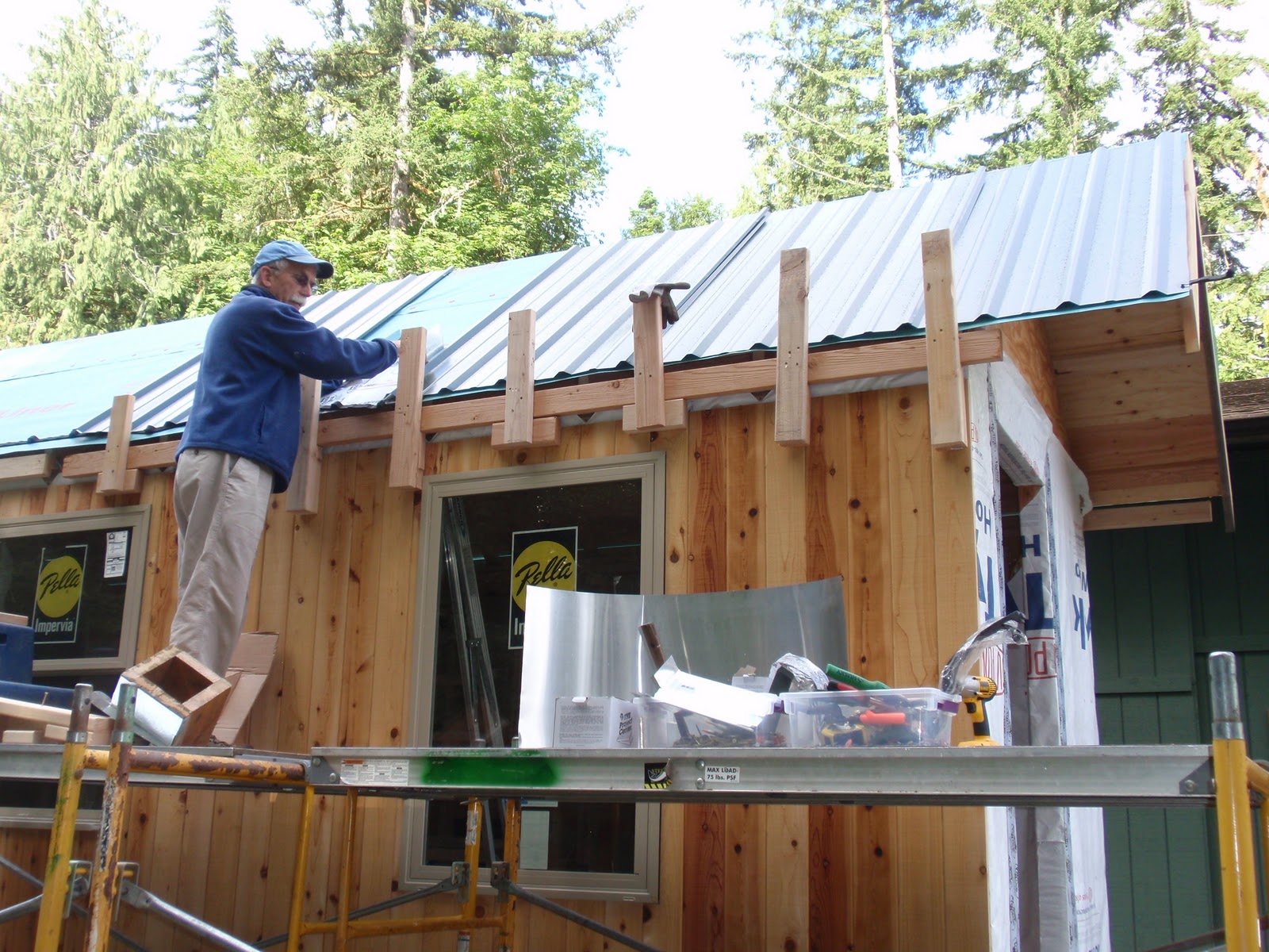 These boards above are cut down 2x4's to be 2 1/2 inches wide. I stained them and am going to use them at the top of the wall to separate the ceiling boards. They should provide a good transition piece. As you can see I have part of my deck done. I am going to put a roof on them that is a mirror of the house roof just a little lower. I am hopeful to have a dry environment on the deck so that I can set up my trainer for my road bike. I am eager to start riding again as I have give it up for 2011 to build my mobile cottage. Off the deck is the mini orchard, my view.