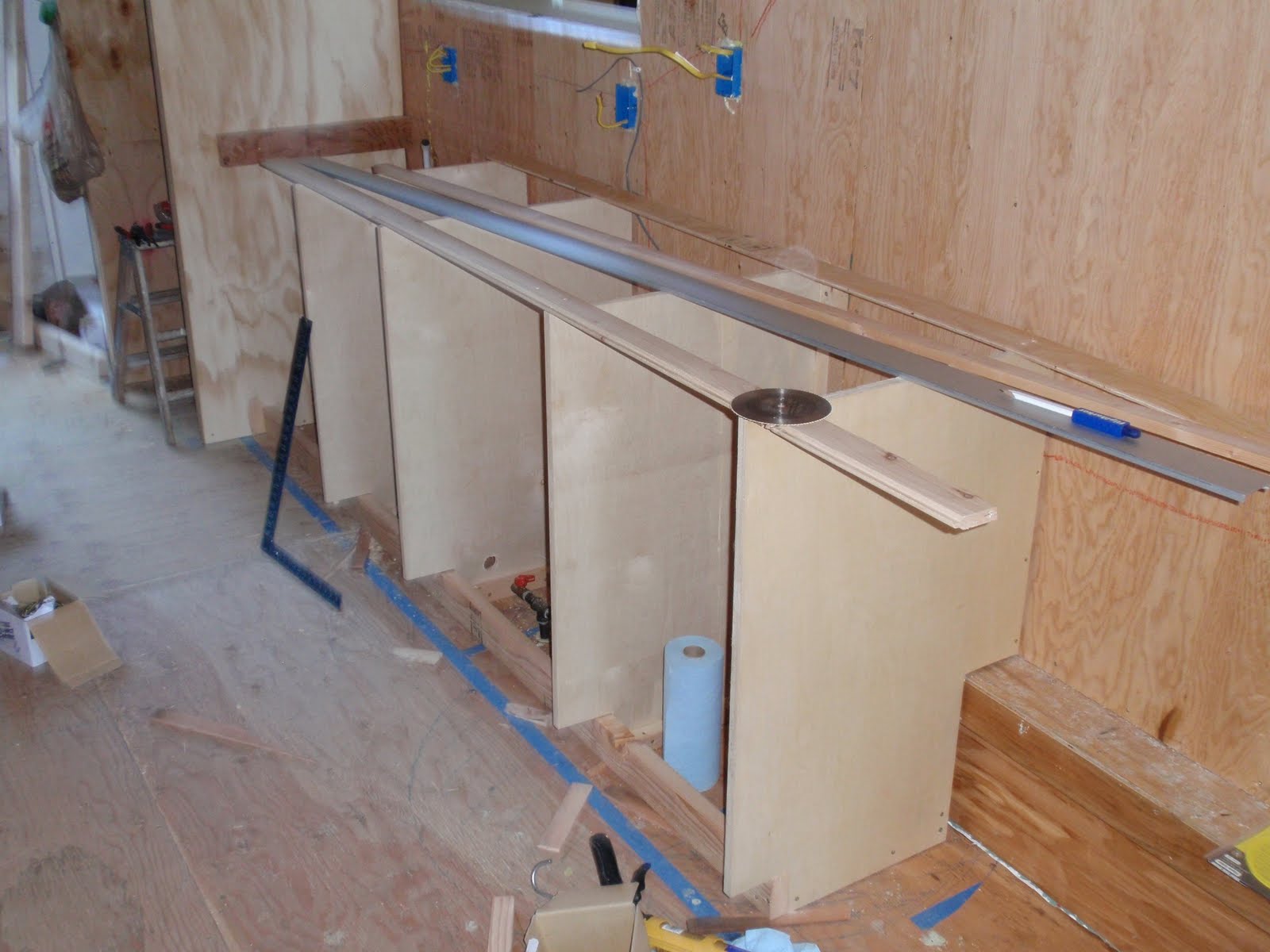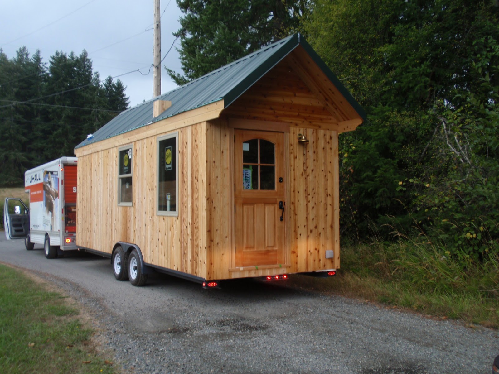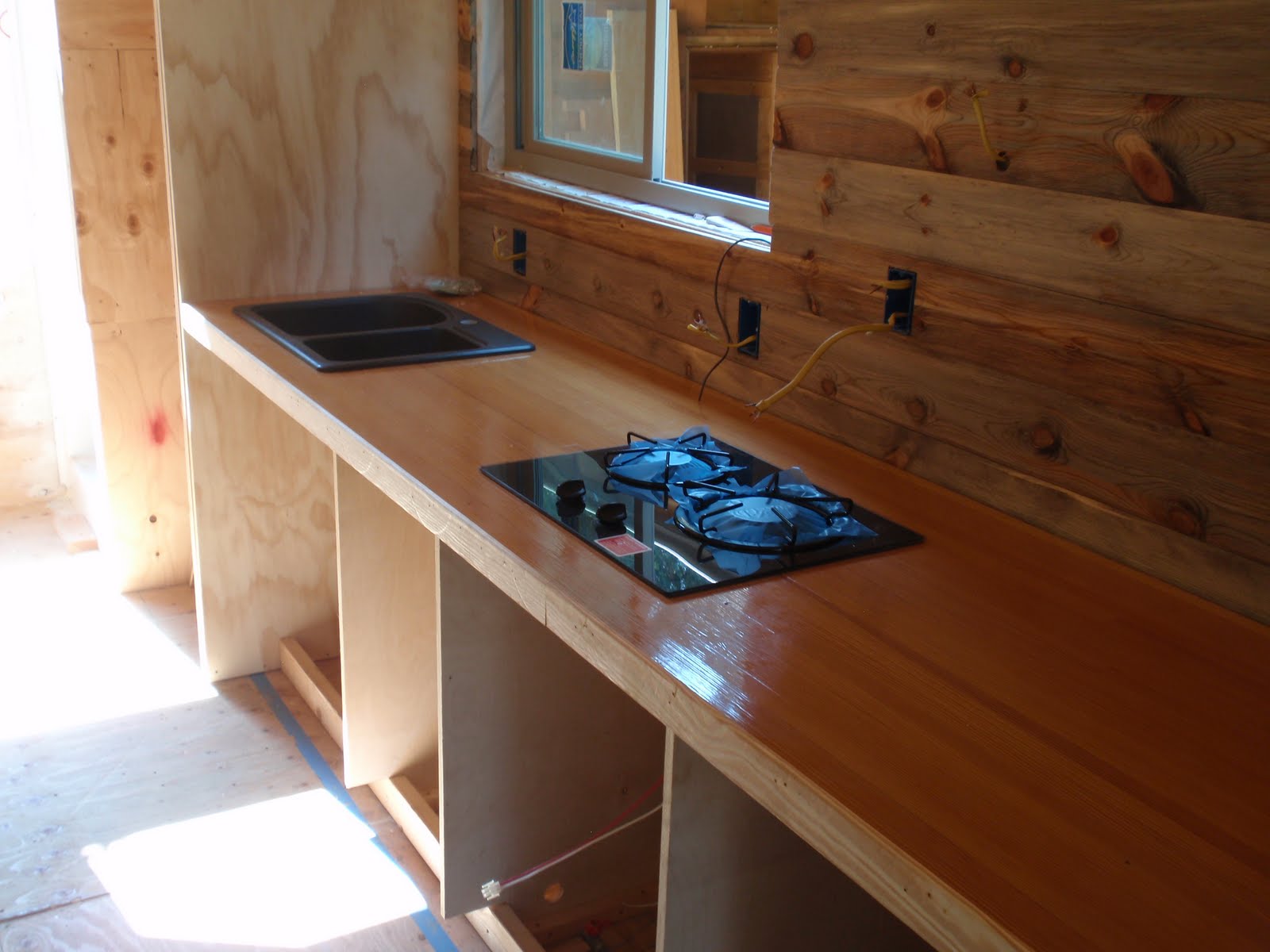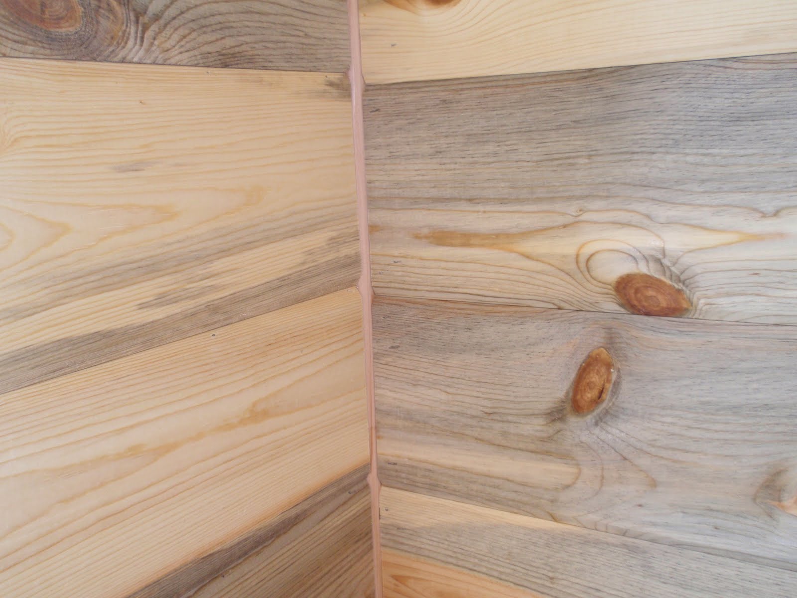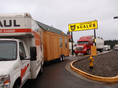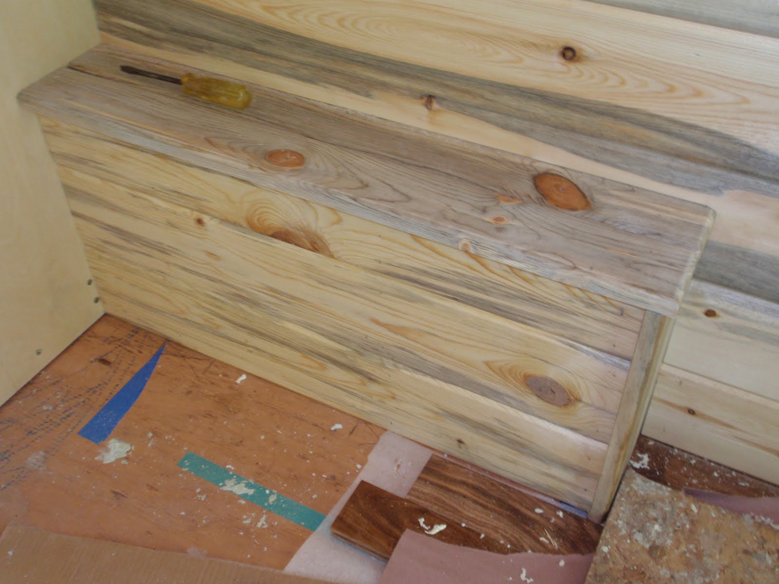 These boards above are cut down 2x4's to be 2 1/2 inches wide. I stained them and am going to use them at the top of the wall to separate the ceiling boards. They should provide a good transition piece. As you can see I have part of my deck done. I am going to put a roof on them that is a mirror of the house roof just a little lower. I am hopeful to have a dry environment on the deck so that I can set up my trainer for my road bike. I am eager to start riding again as I have give it up for 2011 to build my mobile cottage. Off the deck is the mini orchard, my view.