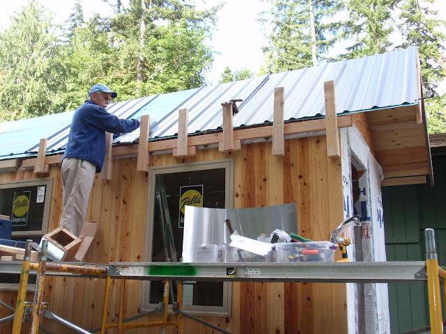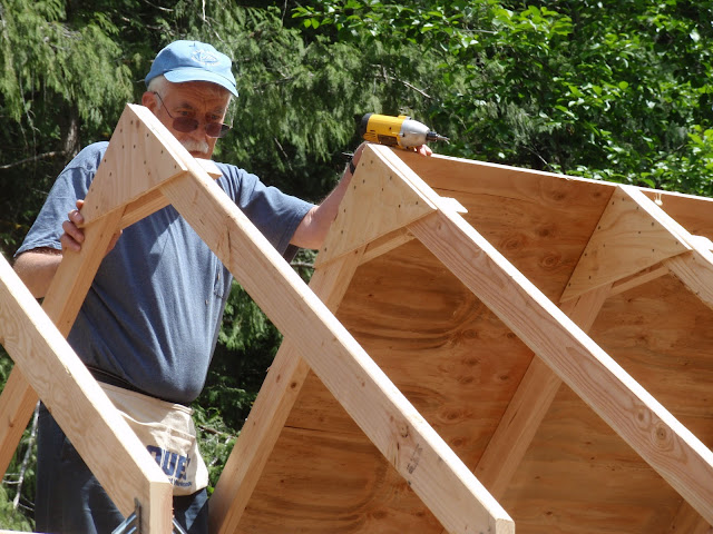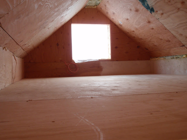 In the fore ground is out of control Rhubarb that might find it's way into a pie if I have time. I was able to spend a little time in the cottage and got the loft boards in. I am pleased with how much room I have up there. It is larger then I thought it was going to be. Plenty of room for my bed and some storage space.