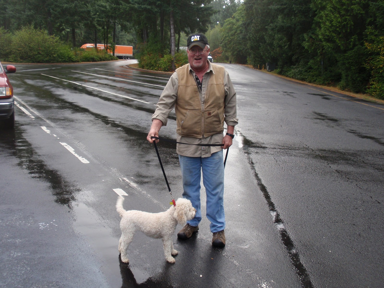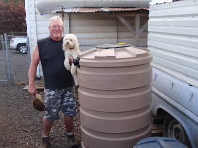 The next "big project is building a catchment system prior to the rain, so I will have to start on that this week. Here is a picture of my catchment tank and my brother and his dog hamming it into my blog. Glad to have his house to finish this project and a place to stay for my first winter.