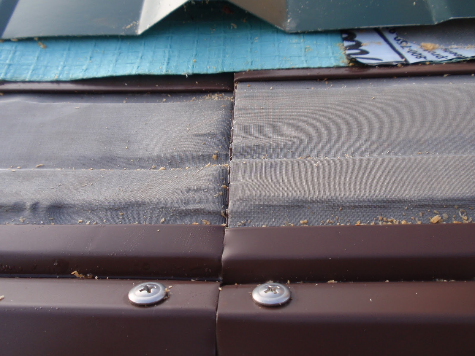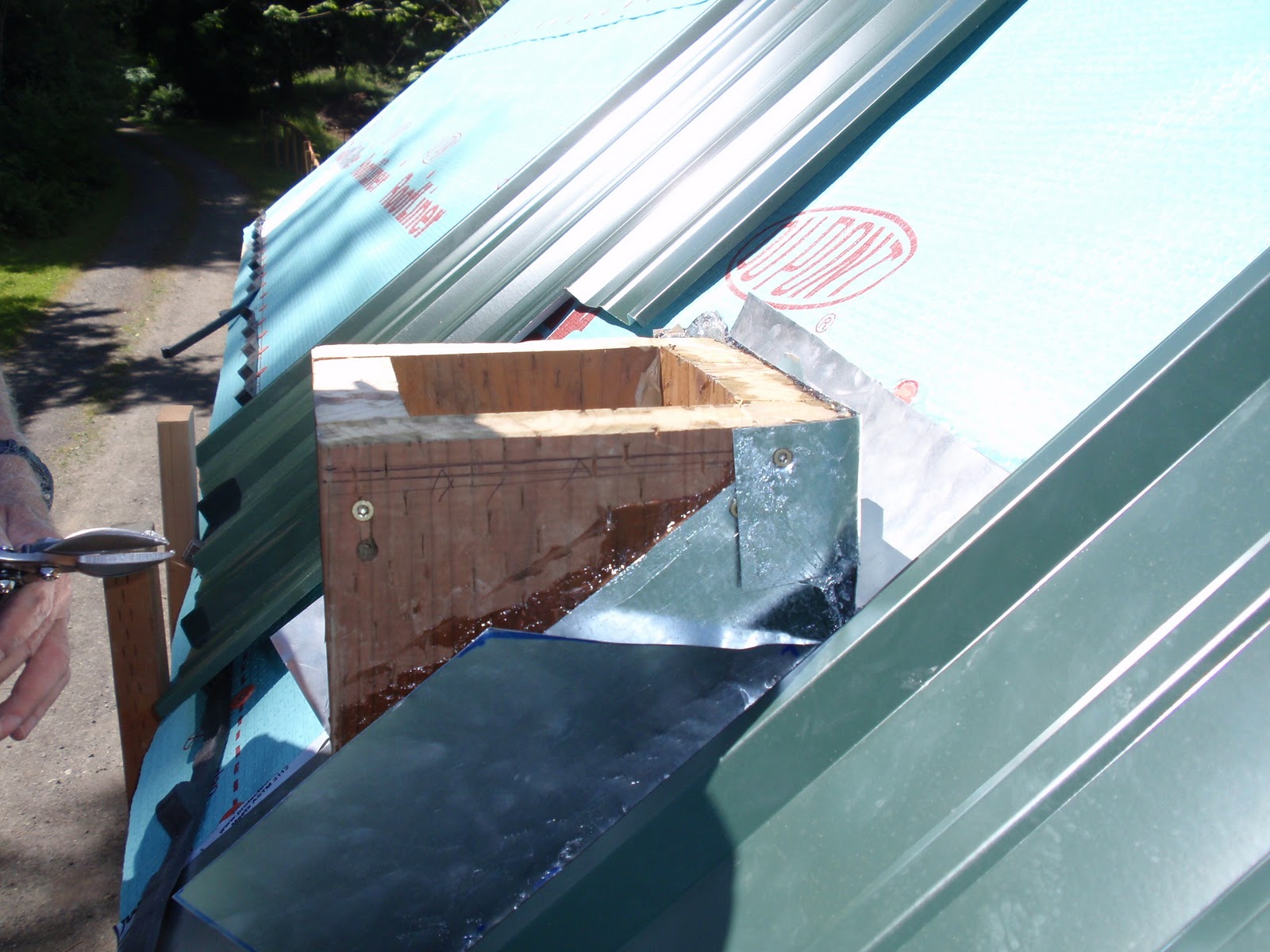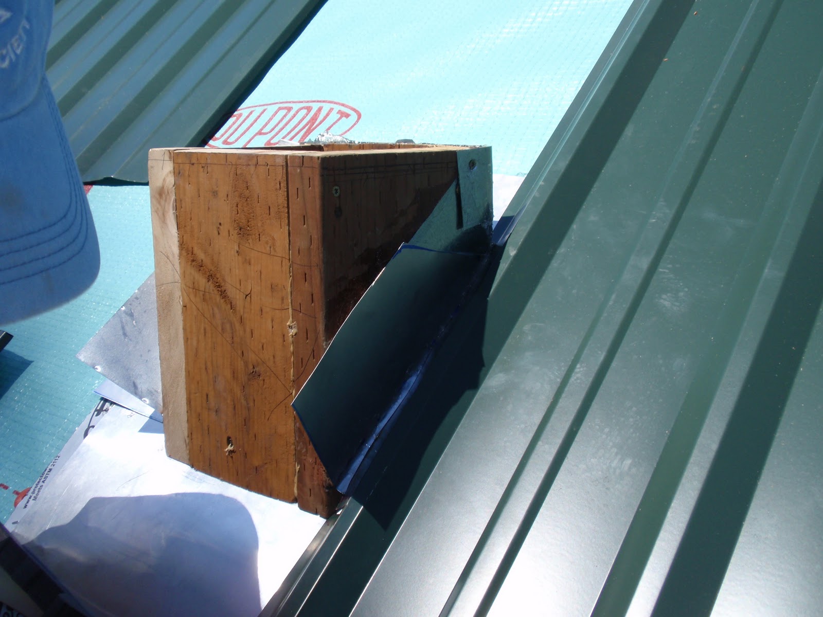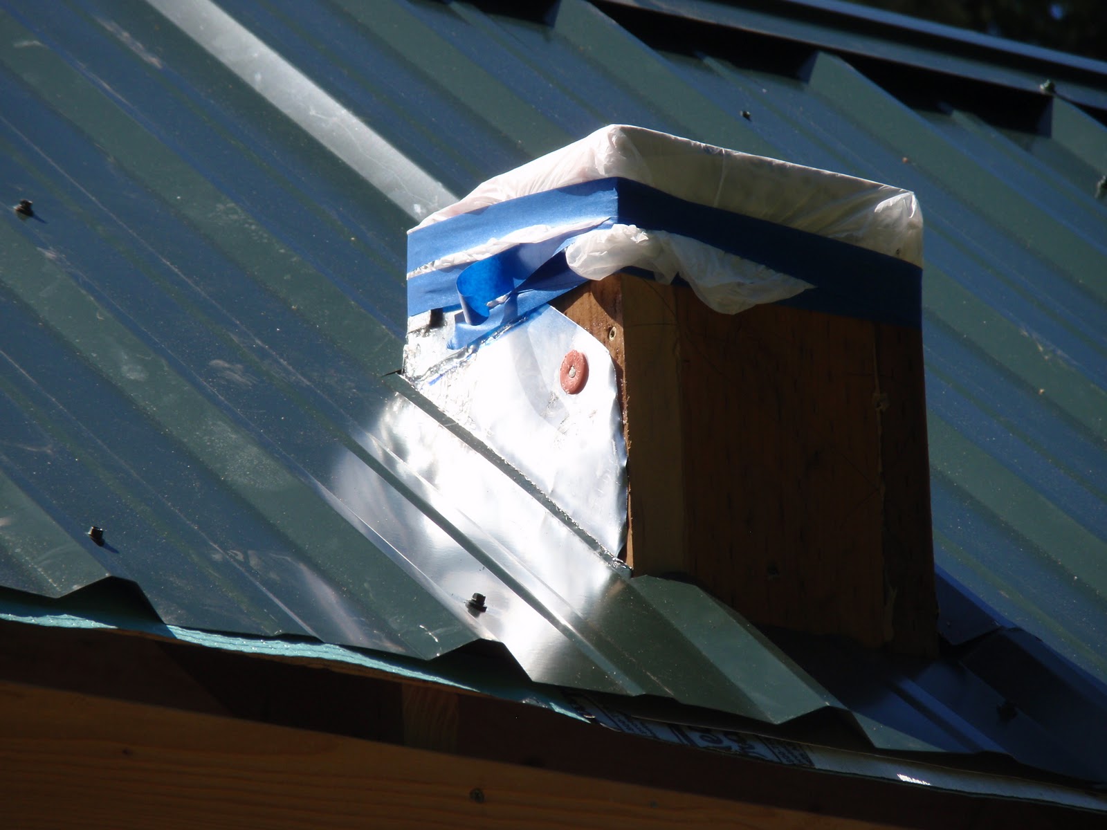 We then cut a hole appropriate for the shaft in the roof liner and cut out the hole in the plywood. We then covered a large 2ft x 2ft space with the same Butel tape we used around the windows and doors. Heavy Duty and very water proof. I then drilled a hole through the whole mess. We figured out where the hole would be in the metal roof and where the "fireplace chimney would be placed. Our big concern with the hardware that was provided was there was no upstream prevention plate to stop water draining down the roof from seeping in. So Stet built it with aluminum stripes I bought from home depot.