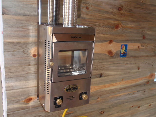 Other events was finishing the propane which allows for the water heater but it also means I have a heater. First I needed to get exhaust stack in place and that was easy enough, then I mounted the Dickinson Stove and hooked up the propane, checked for leaks and you guessed it, Heat.