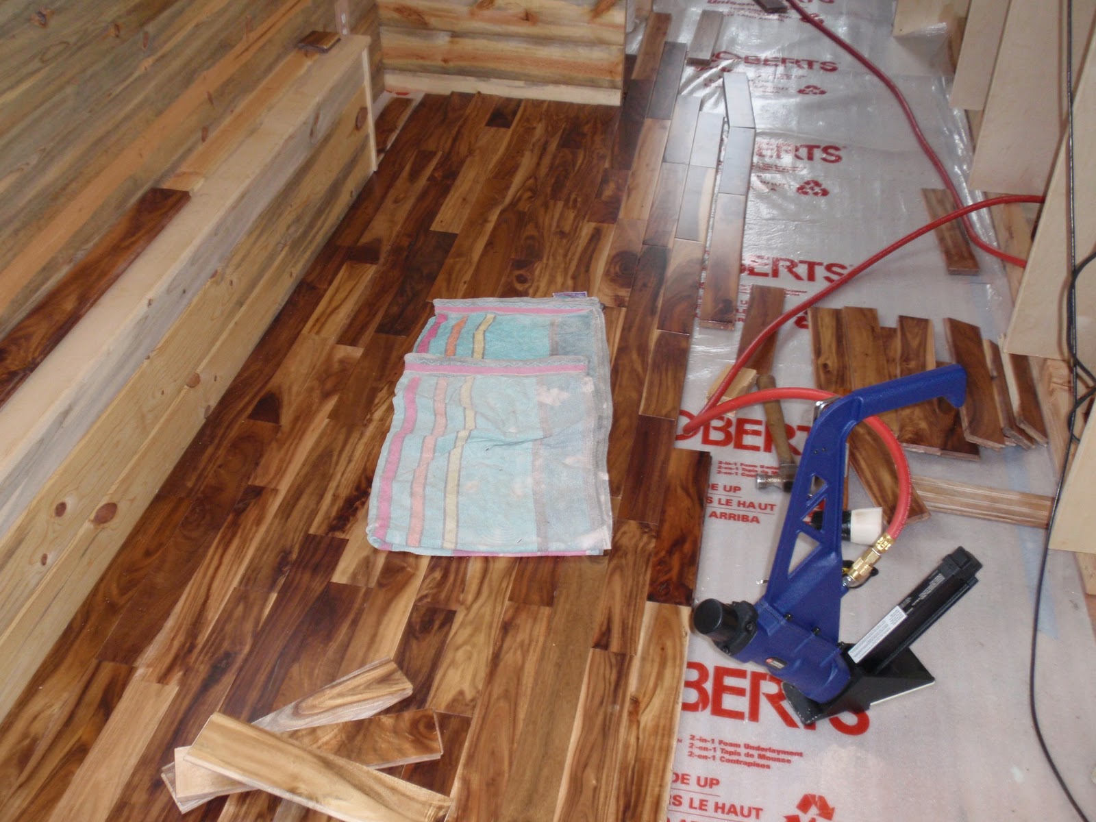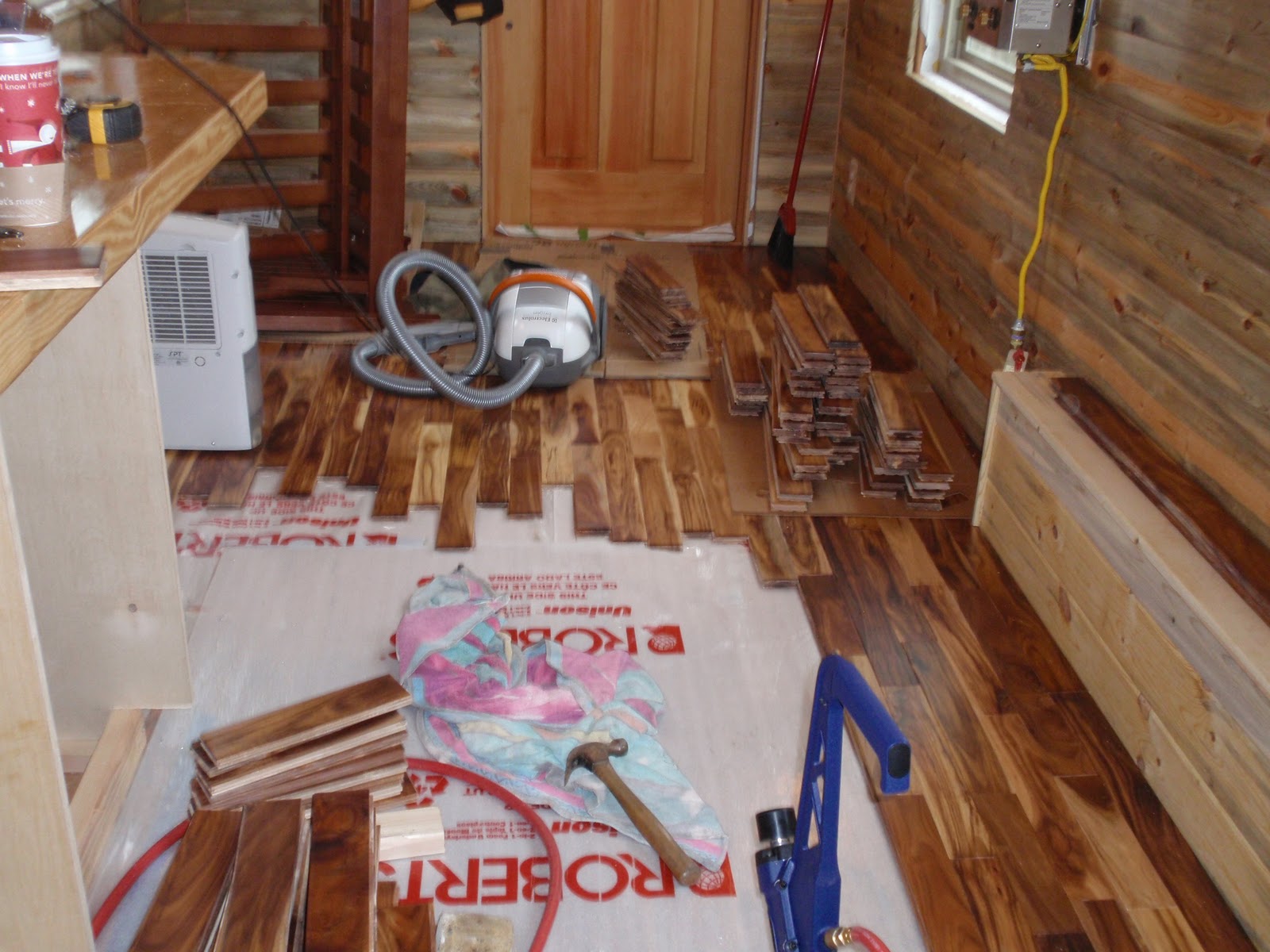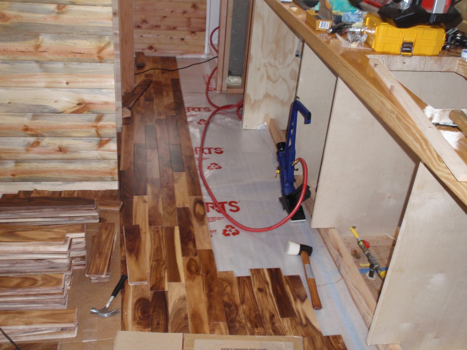 I laid down flooring foam on the plywood and that really seemed to help in laying out the floor boards. There is no squeak in any of the boards. I used a flooring gun where I could. The biggest pain is that I am no spring chicken any more and I bet my average was I got up twice for each board I put down. I needed a hammer that I could not reach, or needed more nails, or I had to cut a board - oh about 4 times, or none of the boards next to me would fit right, it just never ended. I think my next cottage will have vinyl floors.