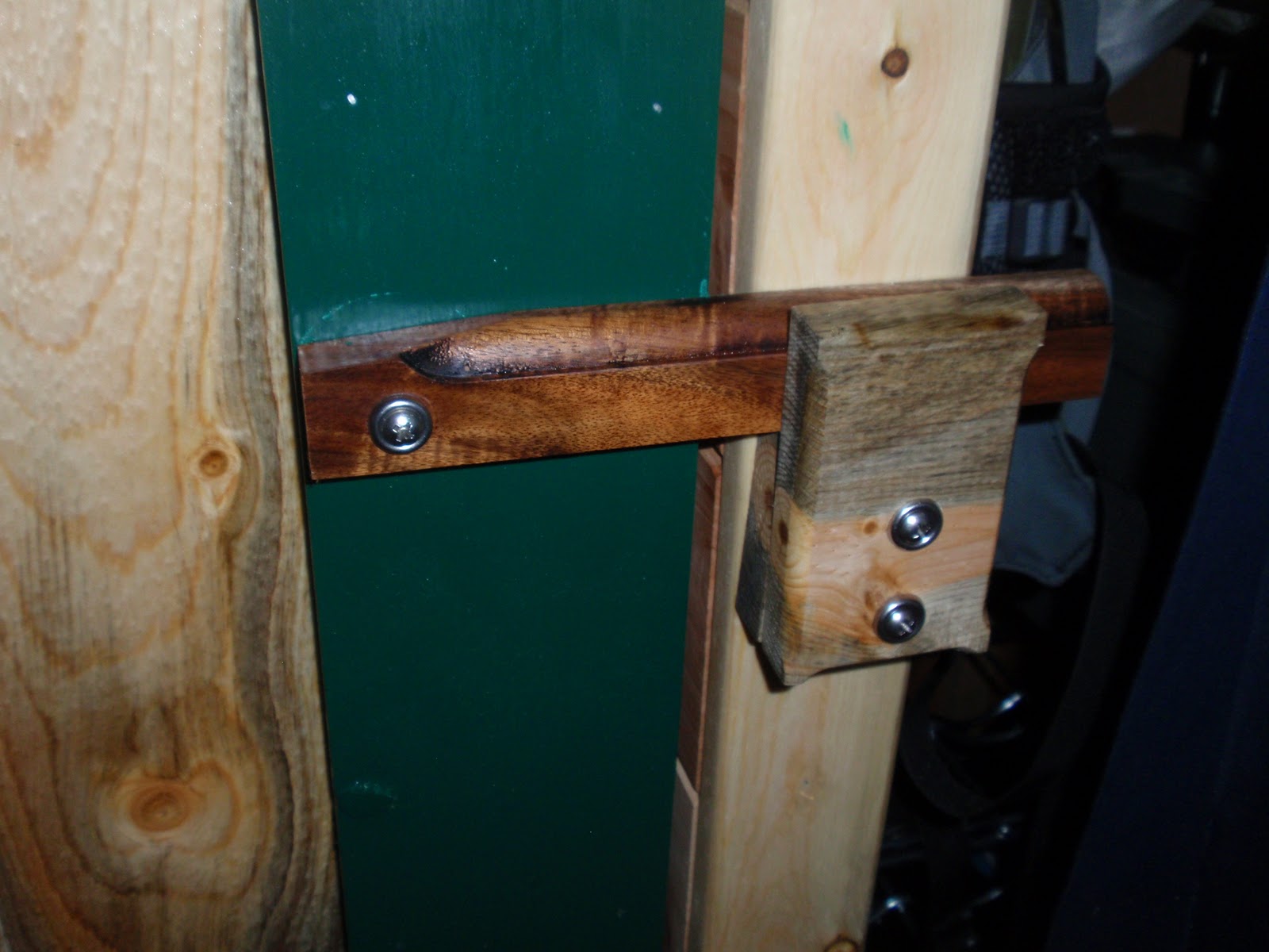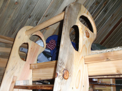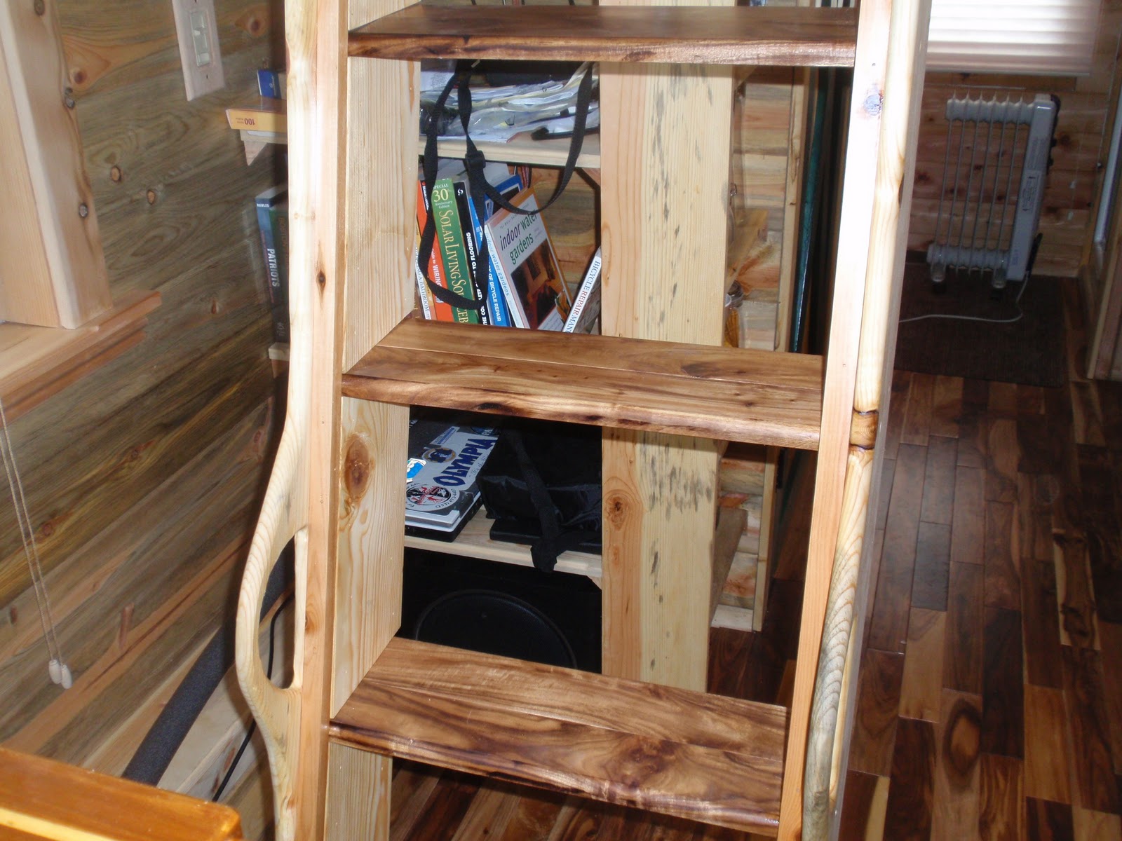 So here is what I wanted, a ladder that had the hand made look, had some pieces and parts made from what I made the cottage with, Beetle Kill Pine, Acacia Flooring, Cedar, Same Fasteners. I wanted really good sturdy hand grips at the top and the bottom so I put large doweling as part of the stability/hand rail. I needed something that would carry my weight and be very stable. Here is what I came up with