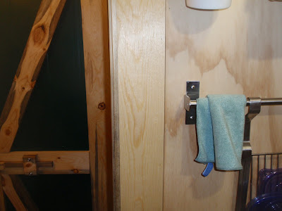 This faces inside the cottage if I want to hold the door shut. I can also swing all the open against the shower door if I want access to the pantry/refer and still collect light from the window in the bathroom. The best of all worlds. I found this great picture on "barn door latches" search on bing that I copied for my latch.