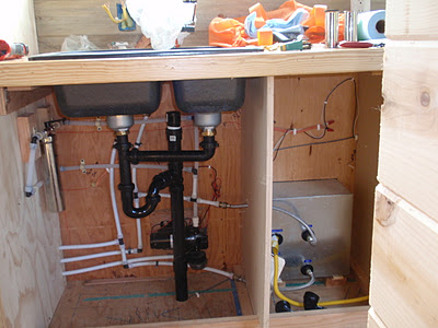 So the 205 Gallon tank worked well, I did feel I was wasting a lot of water with my limited capacity, so I think I will upgrade to a 500 gallon tank at some point. I get 151 gallons from every inch of rain. I am using a flo jet 12volt water pump and am having no pressure issues out of the sink or shower. I did originally install a filter that I had to remove as the pump would just not pump through it. I also added a boat accumulator tank that stopped any pump hammering. Here is a shot of the old filter system.