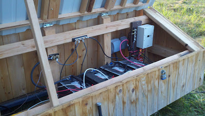 As you can see from the picture I am coming in off the two panels into a bus bar, go through a 40 amp fuse and into a cut off switch and then into the Charge Controller. Coming out of the Charge Controller I go to a 50amp fuse and then into the batteries. I am running 4 - 12volt, 100 amp hour batteries. I monitor all this with my TriMetric battery monitor (TM-2020). I got it from Backwoods Solar who is also excellent to work with and would recommend them highly.