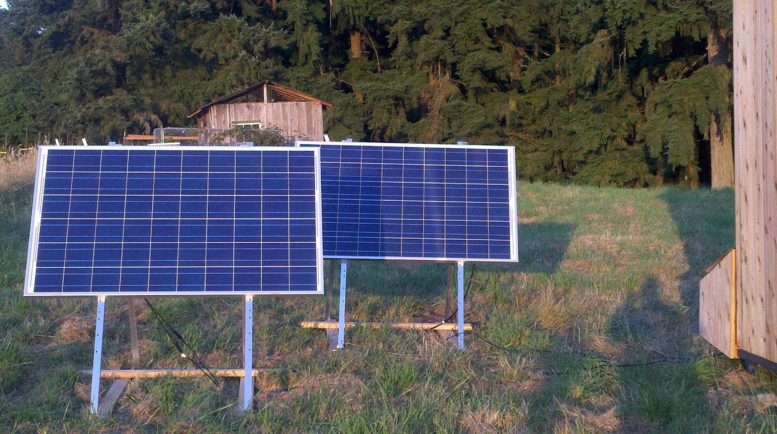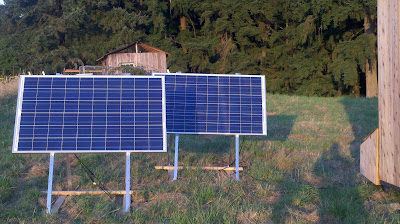 With the awesome weather in the Pacific NW this summer, I decided to take advantage of it and added two new solar panels to my mix. I purchased them from one of my two sources of solar equipment, GoGreen Solar. While their web site was not clear on the minimum amount of panels you could buy (I wanted only 2, they now have a minimum of 5) They were good to work with and went out of their way to make this work for both of us (I got a very good deal on these panels). The panels are 235 Watt Conergy and since I now have two I am pumping 470 watts of goodness into my batteries. I also added BZ MPPT500 Charge Controller, seen below as the white box.